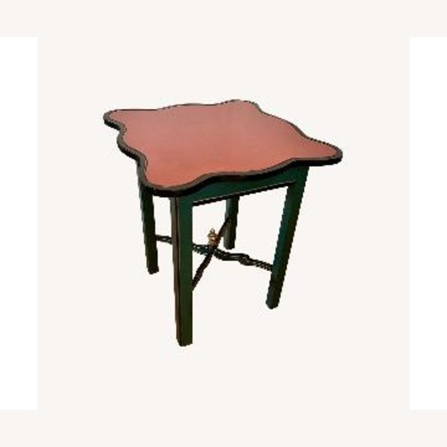 Seller's Notes:According to the original owner this is a whimsical vintage cottage-core riff on French-style card/game table in vibrant rich colors of red and green. Curved freeform top with carved, hand-painted styling and playful details. 28”H x 23”W x 23”D.