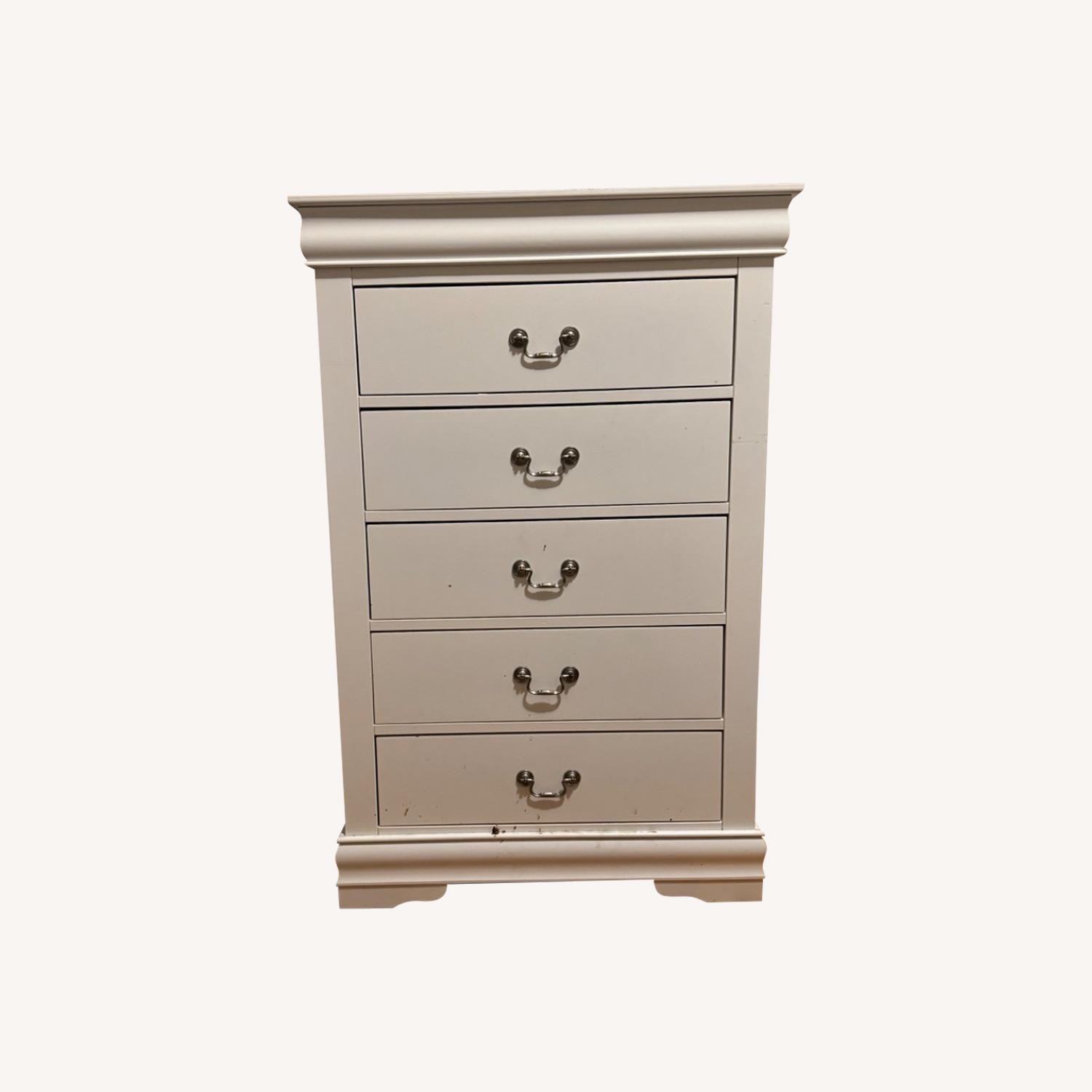 Seller's Notes:White 5-Drawer Chest-Classic and Functional Design Dimensions: 48” H x 31 1/4” W x 15 3/8” D Condition: Good, with some minor scratches Features: Five spacious drawers with silver colored handles.