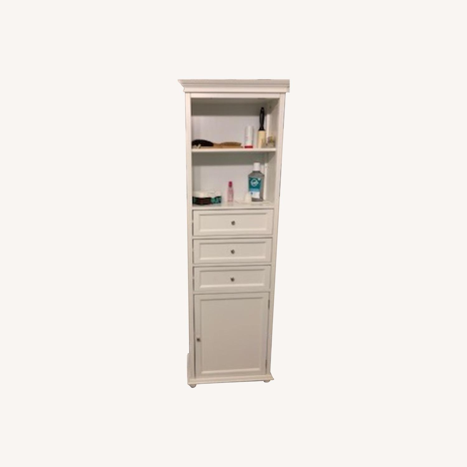 Seller's Notes:White Bathroom Storage Unit (19.25x8.5x67.5) Middle shelf inside cabinet.