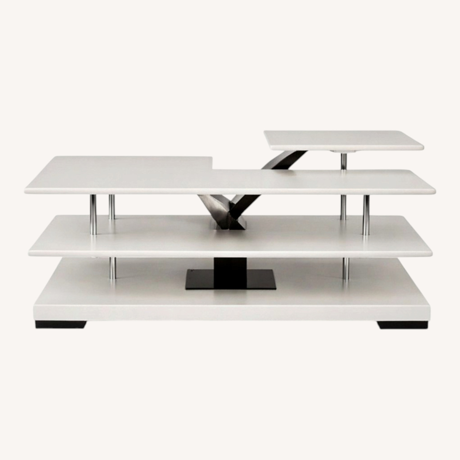 Seller's Notes:Contemporary coffee table! Featuring a unique multi-level design with clean lines and a stylish black accent base, this piece is both functional and eye-catching. Condition: Gently used – in great condition Dimensions: 32" x 44" | Height: 17" 💲 Price: $300 Perfect for displaying décor, organizing essentials, or adding a modern touch to your home. Sturdy, stylish, and ready for its next space!