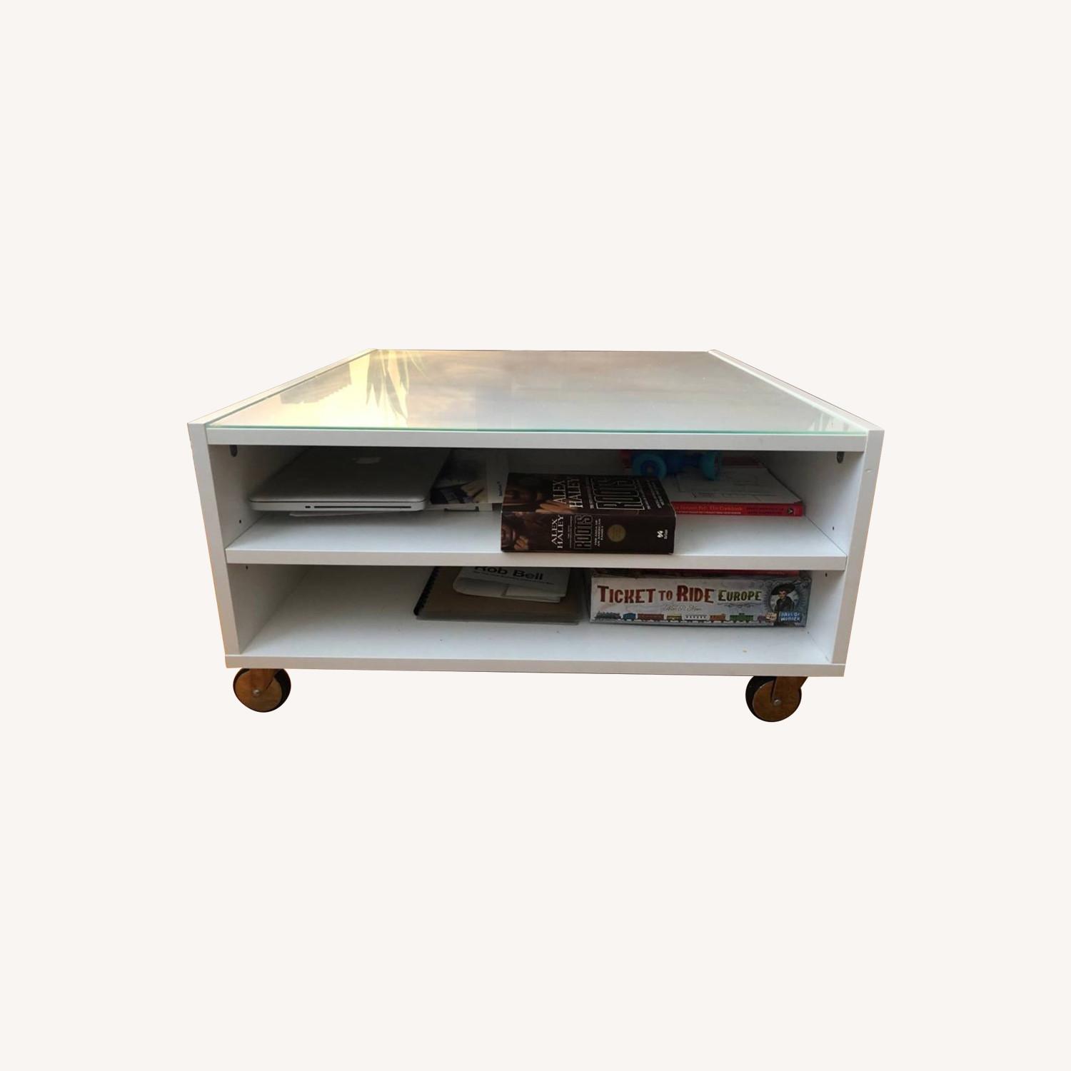 Seller's Notes:Sadly parting with this wonderful white coffee table with a glass top as it no longer fits in our redesigned space. It has PLENTY of storage on 2 sides and rolls on wheels. Easily moved out of the way for NYC modular living...I think you could remove them, but I've never tried. Must go ASAP. Unfortunately, I have no idea the make and the model. Dimensions are 31" W x 31" L 16.5" H. Less