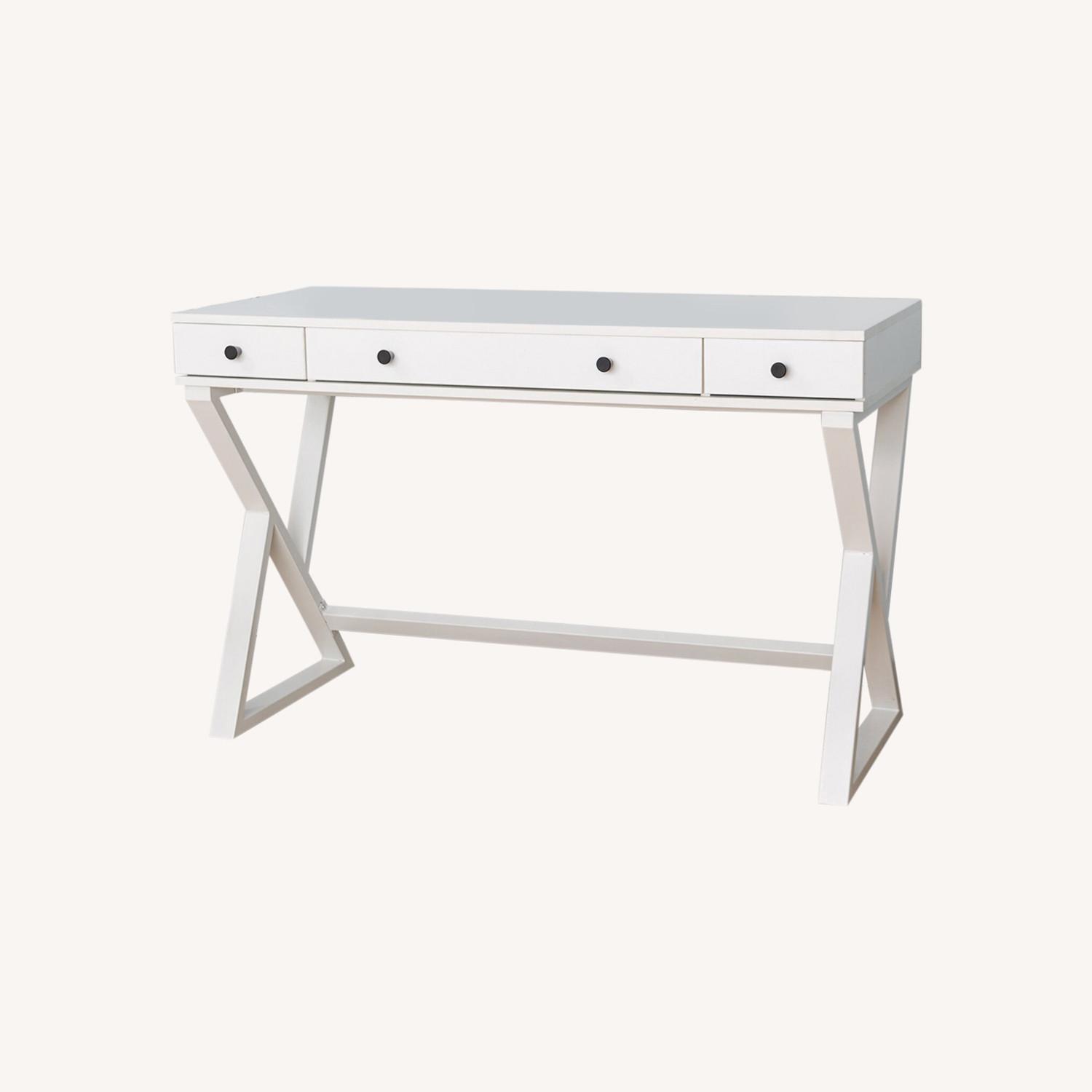 Seller's Notes:Barely used (4 months), in excellent shape with no blemishes. Desktop is water and oil proof, quick-dry, and easy maintenance. Triangular-shaped metal legs. Smooth drawer slides and metal handles. The door of the big center drawer can fold flat into a keyboard tray. Two small drawers provide extra storage space. Note pickup location is a single family house with no entrance stairs.