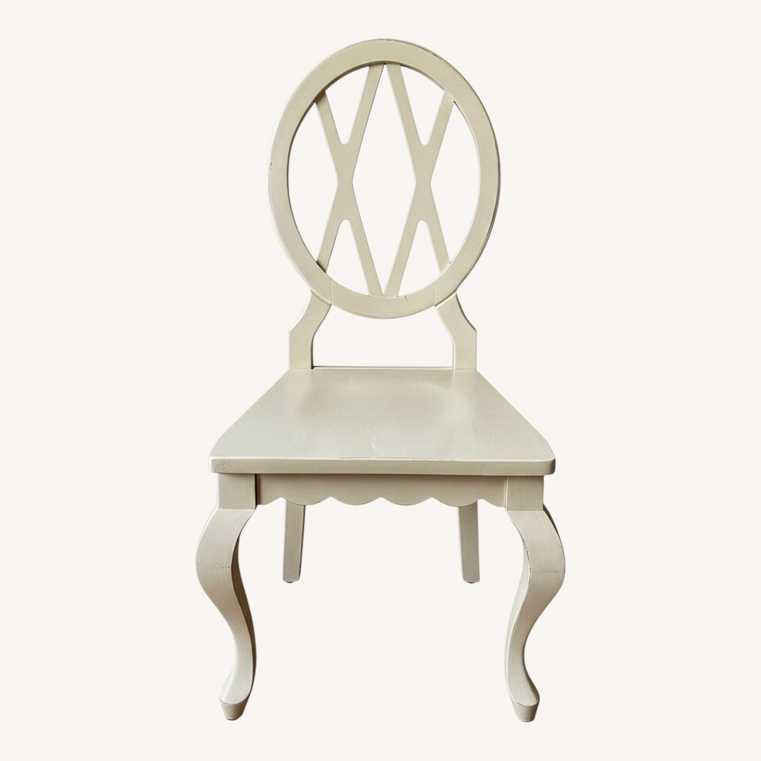 Seller's Notes:Excellent condition! Heavy and very well made. Just used in the dining room so they don't have much wear. Just the normal. Approx dimensions: 20" at the widest point of the seat. 41" total height, 18" seat height. See the pics for the purposeful distressed off-white paint color. It was manufactured like that to have the distressed points.