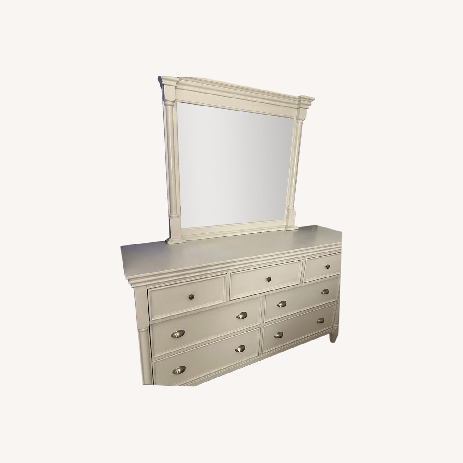Seller's Notes:White Dresser with Mirror Mirror can be attached to dresser or can be detaches and mounted to a wall instead (I have done both in different apartments) Height = 32 inches (top of dresser to bottom of legs) Width (side to side) = 64 inches Depth = 17 inches