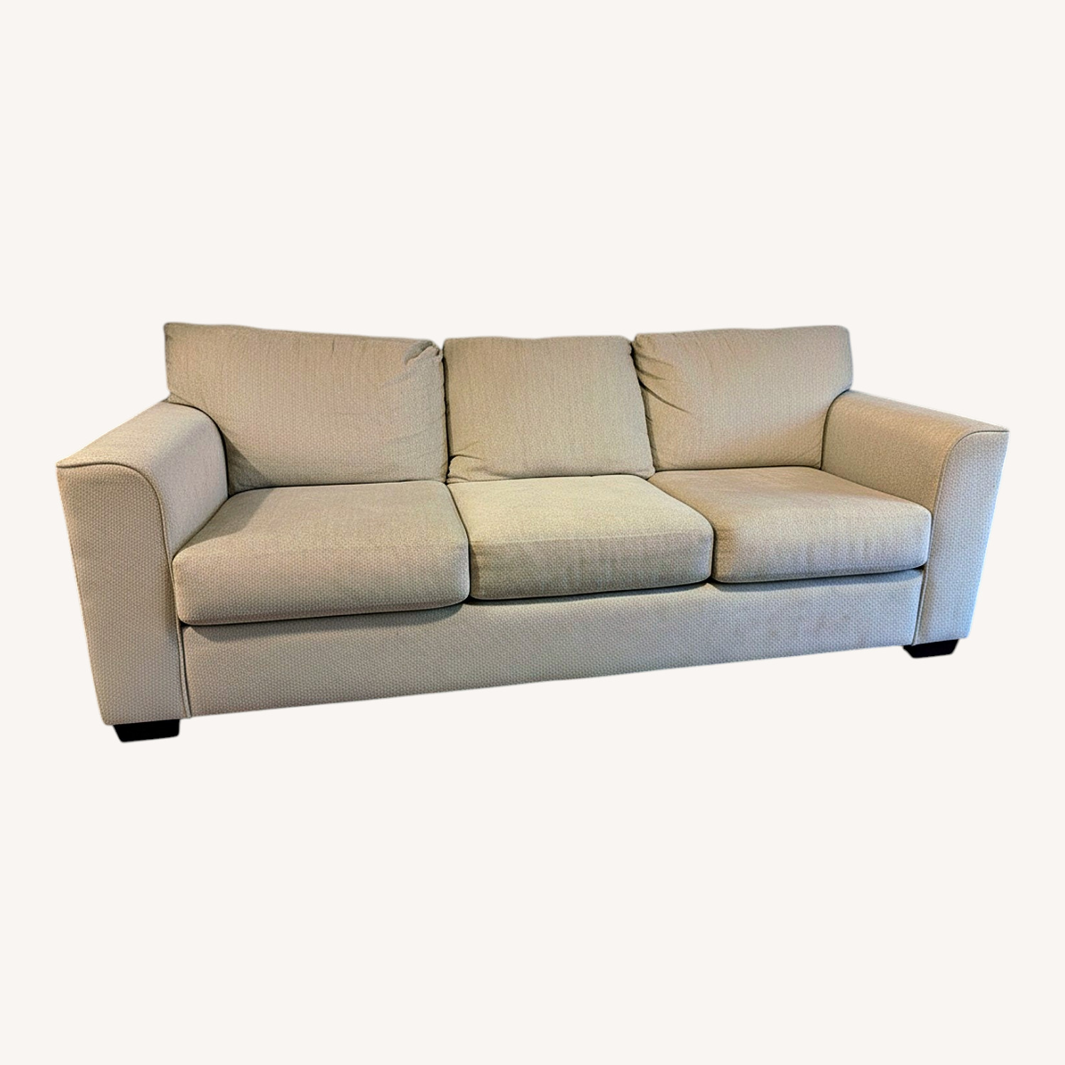 Seller's Notes: Beautiful and comfortable Cindy Crawford Home sleeper sofa in a neutral beige color. High-quality piece that easily converts into a bed-perfect for guests or extra sleeping space. • Queen pull-out sleeper bed • Well-known Cindy Crawford brand (great quality) • Neutral color matches any décor • Clean, no stains or damage • Very comfortable for both sitting and sleeping Smoke-free