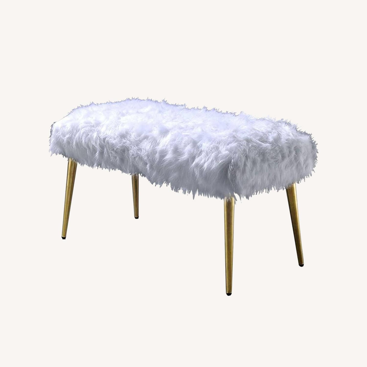 Seller's Notes:Make a comfortable yet stylish seating space in your bedroom, and corner spaces with the inclusion of this modern style bench. Designed with the vision of providing utmost comfort, it features white faux upholstered cushioned seat which is supported on metal tapered legs in gold finish and easily blends with a variety of ensembles. This bench offers a perfect seating for two people and makes a great lounging area. The floor protectors secure the legs and provides a scratch free mobility.