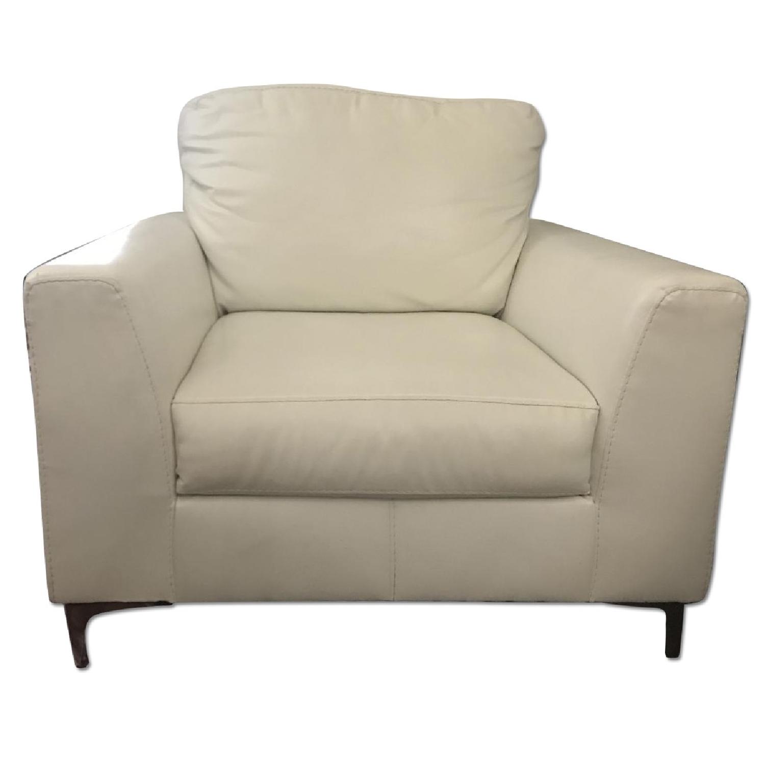 Seller's Notes:Age: This chair is about 2 years old. Condition/damage: The faux-leather has some wear/crackling and the stitching is discolored/faded (particularly along the top of the back cushion). Comfort: Super comfortable and roomy. Plenty of life left and great for lounging. Appearance: Great for those who love modern/minimalist style, but still want comfort Dimensions: 33 inches high x 36 inches wide x 34 inches deep