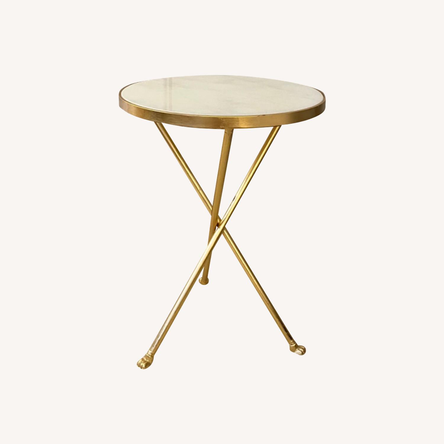 Seller's Notes:Beautiful side table with white granite top and iron tripod base with gold patina finish. Some discoloration on one leg. Is well hidden depending on which way you turn the table.