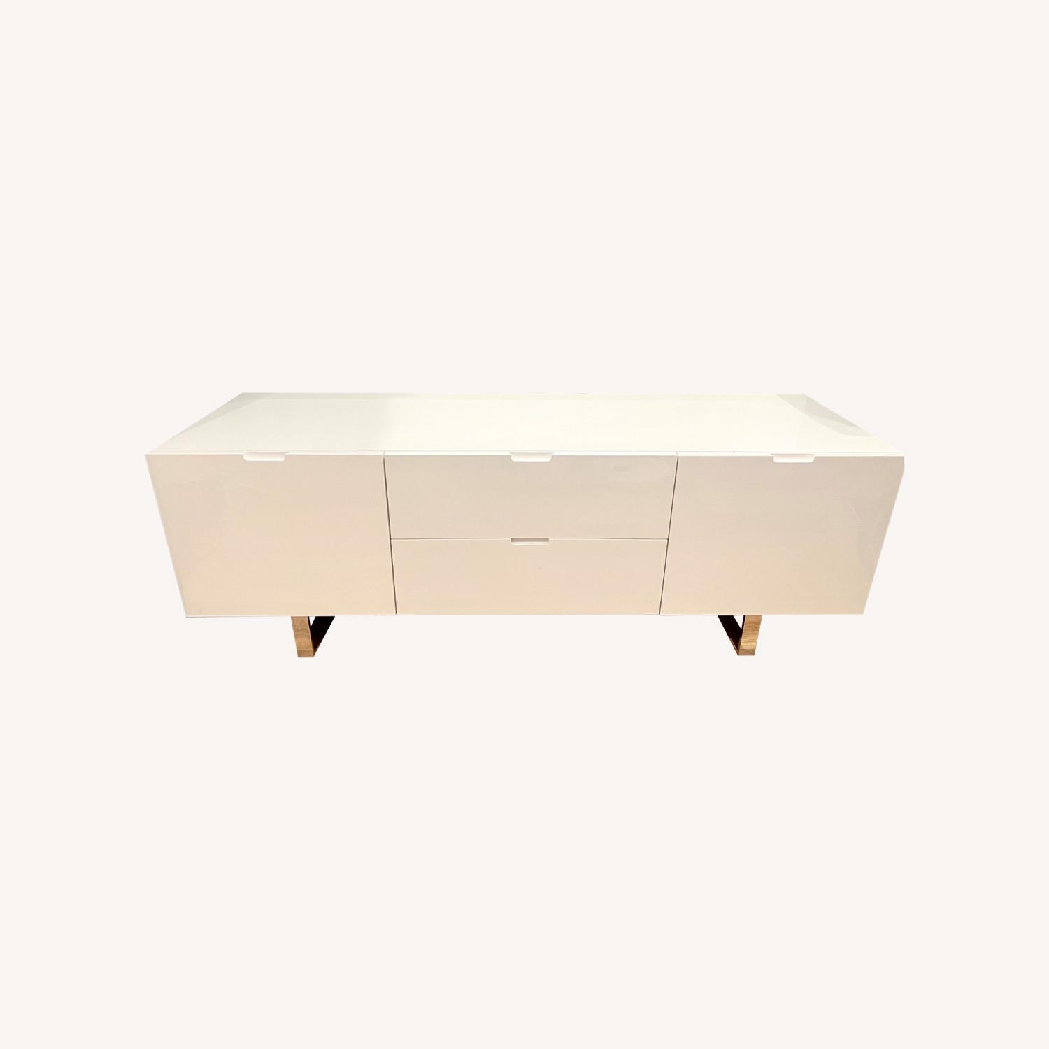 Seller's Notes:The white high glass lacquer modern TV stand with polished stainless steel legs was purchased in a designer store in New York City in 2012. It was part of the modern condo design and maintained in an excellent condition. Due to remodeling, this TV stand was moved to a guest room and looking for the next owner who can have a good use of it.