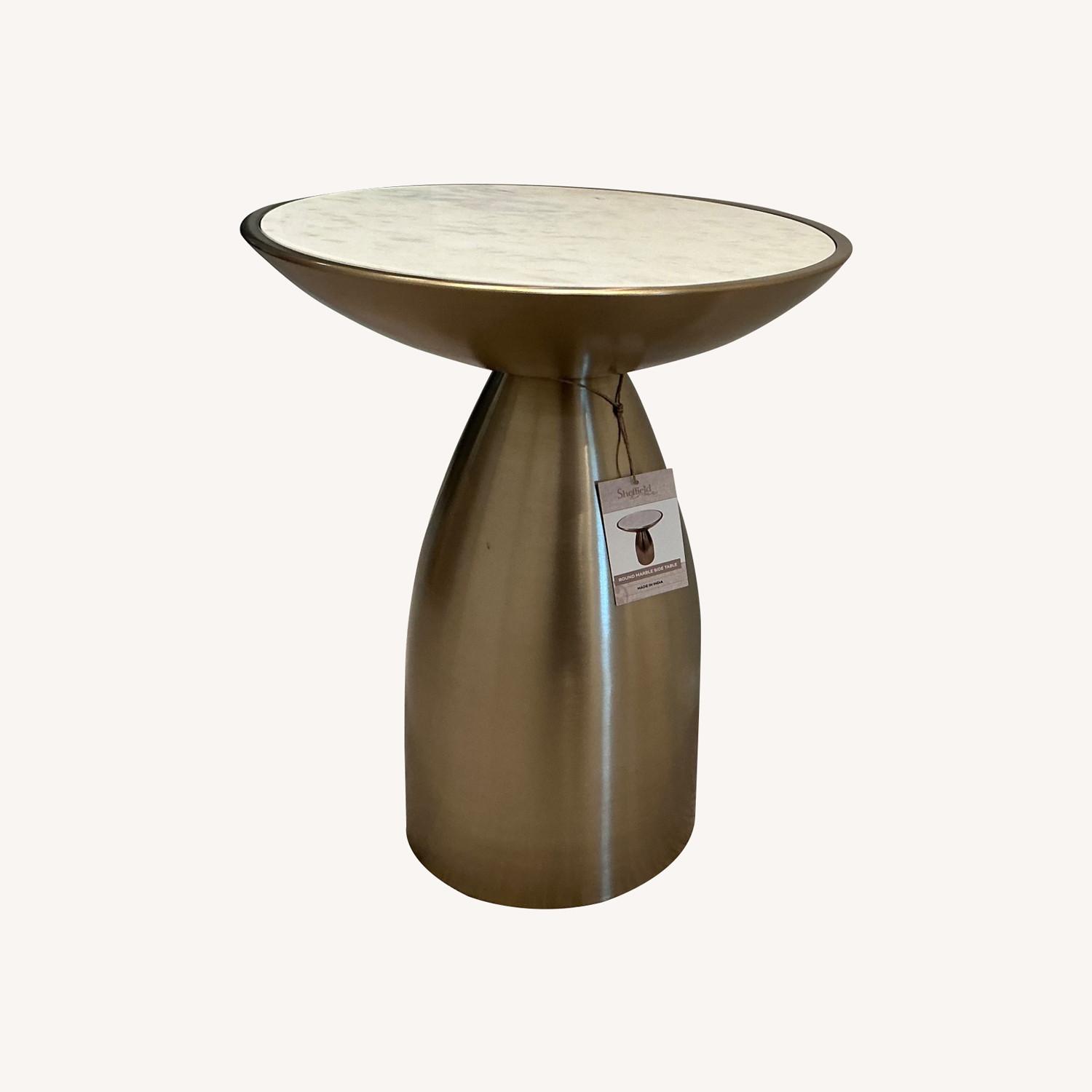 Seller's Notes:BRAND NEW WITH TAGS. White marble top with brushed gold brass side table.