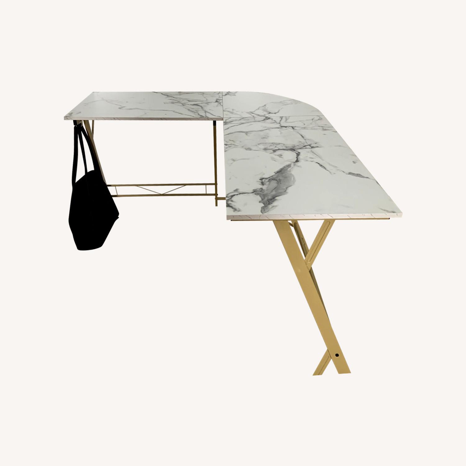 Seller's Notes:L-Shaped Corner Computer Desk Description: * Color: Marble White/Gold * Features: L-shaped design, versatile for working, studying, or gaming * Extended hook: Can be moved to either side * Material: P2 MDF Board with a strong metal frame, supports up to 220 lbs * Dimensions: * Overall: 29.5'' H x 51'' W x 48'' D * Desktop: 29.5'' H x 51'' W x 18.5'' D * Long table side: 32.5" W * Short table side: 29.5" W Condition: Used for just over a year