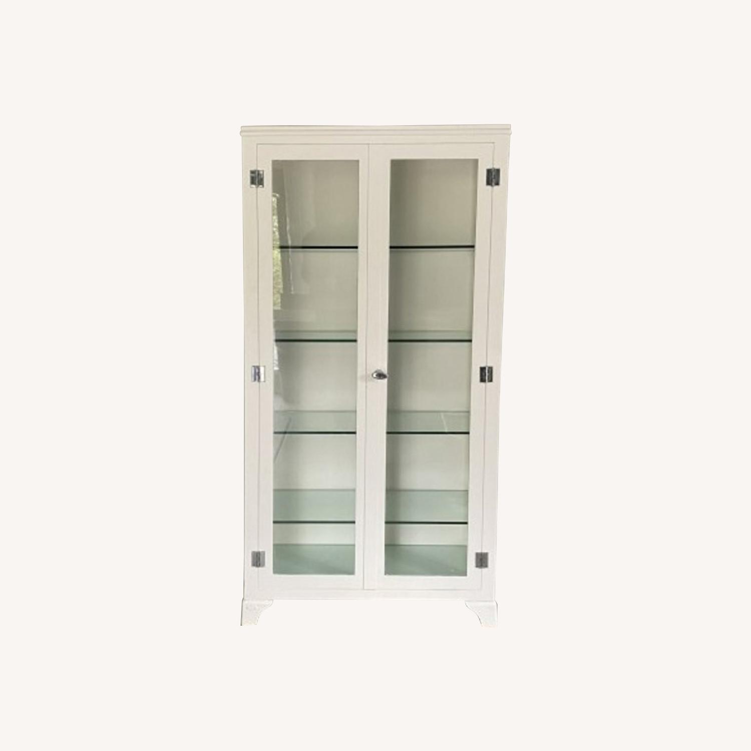 Seller's Notes:A vintage white medical cabinet constructed of thick gauge steel with four 3/8" thick glass shelves and glass bottom. Glass views from both sides panels. Dimensions: 36" W, 70 1/4" H and 16" D Condition: minor blemishes, nics, rust spots. Overall good condition consistent with age and use.