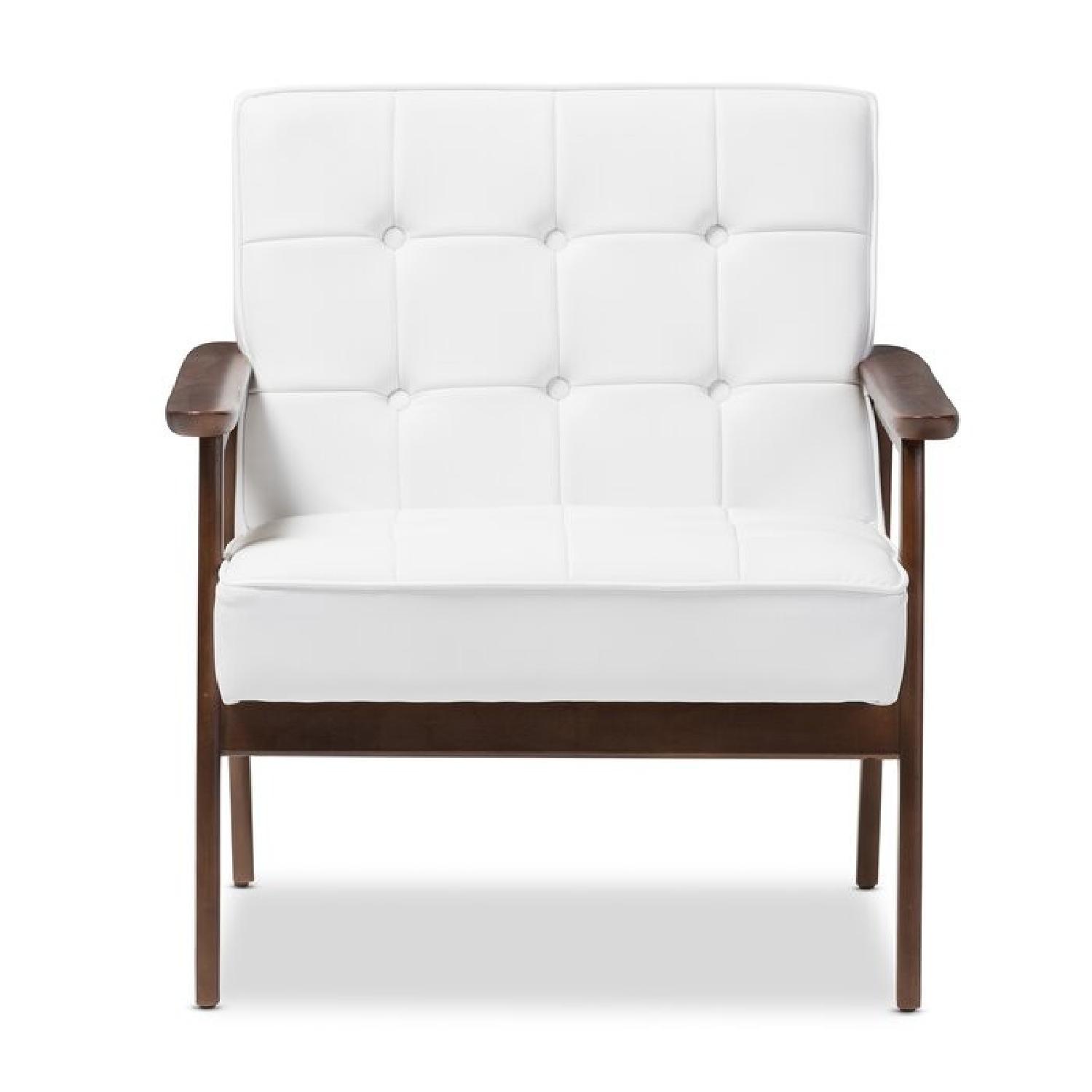 Seller's Notes:AMAZING VALUE! Purchased just 1 year ago for a pad-a-tier in Manhattan that was rarely used. The chair is like new with the very small exception of a minor scratch on the back right of the seat cushion which nobody will notice unless staring at it from close up in a good light. Mid-century modern furniture refuses to fade into the obscurity of the past just one look at this Stratham mid-century armchair and it’s easy to see why! A keen eye will spot the subtle curves of the wooden frame and button-tufted detailing on the seat, which both emphasize the detail-oriented focus of mid-century designers. The white faux leather seat is filled with foam cushioning for just the right level of comfort. This white leather and brown frame make for a perfect addition to any bedroom or living trying to bring a modern and minimalist style with a great deal of class and sophistication all at the same time! Link here: https://www.wayfair.com/furniture/pdp/gracie-oaks-alfson-armchair-w002253999.html