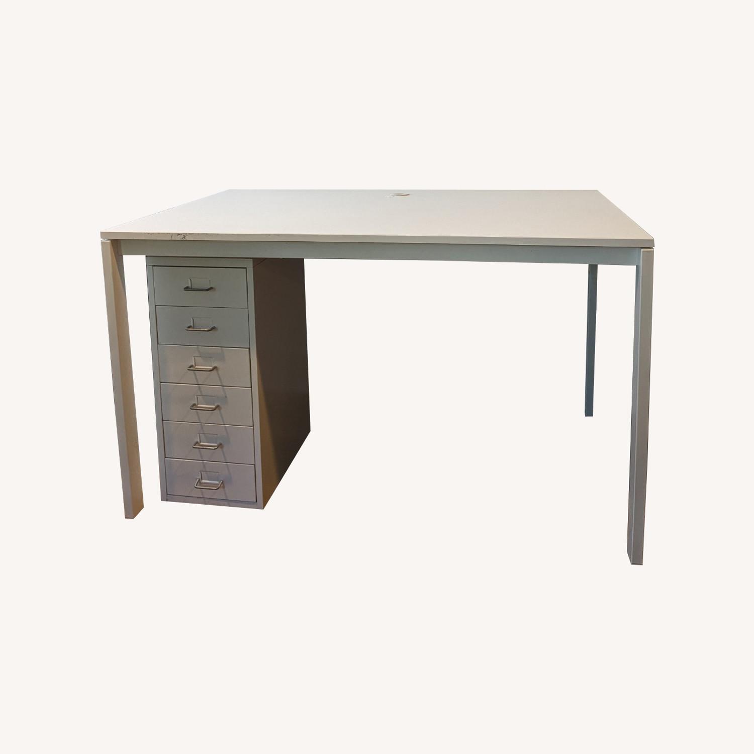 Seller's Notes:My desk was provided to me by my old job. It's been great, super useful. I'm moving and don't have room for a home office setup. The desk comes with an attached power strip, and a cable hole port. There is also a 6-drawer filing cabinet that fits snugly underneath it (though is separate). It's in good condition, with only minor blemishes (pictured).