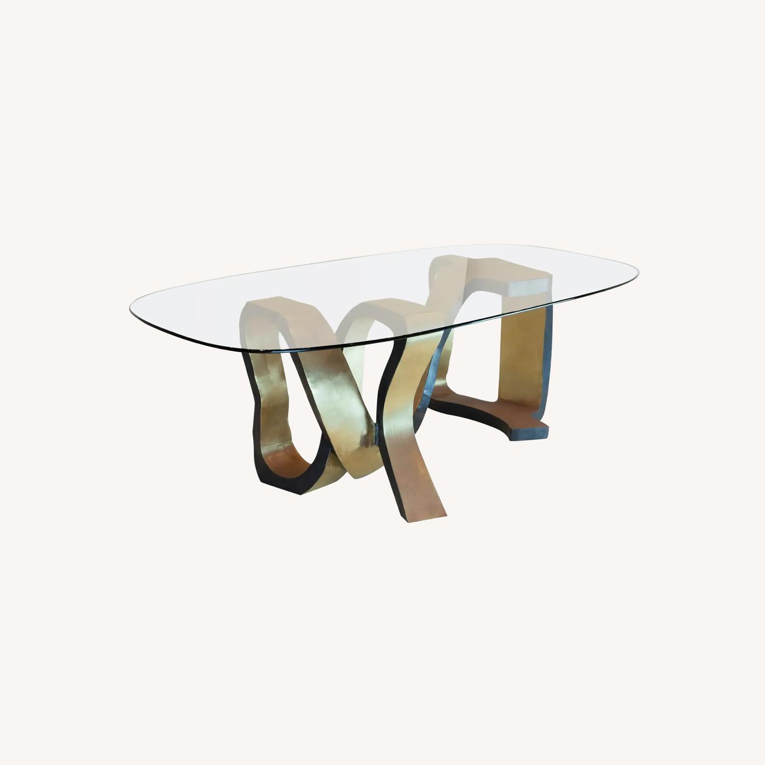 Seller's Notes:The Elite Dining Table is a perfect marriage between ultra-modern design and premier craftsmanship. It’s abstract brass base and rounded glass tabletop give an elevated look to any dining area while still proving functional. The tempered glass top is sturdy and spacious, perfect for family meals or other gatherings. The curvilinear base is crafted from hand-forged brass, featuring a Japanese Patina finish. The Elite Dining Table acts as a functional work of art and fits seamlessly into any contemporary home. Hand forged brass base dining table with Japanese patina finish and featured with glass table top.