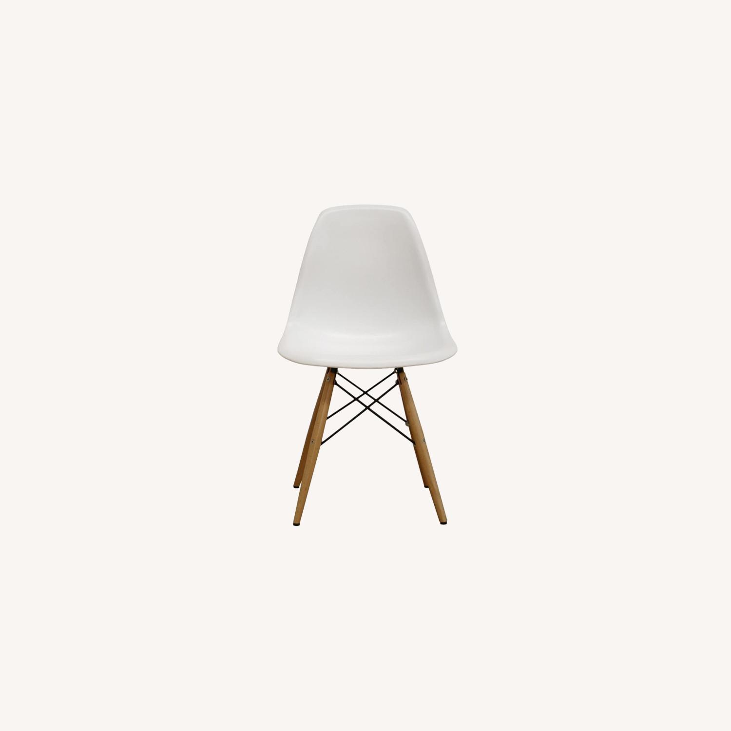 Seller's Notes:Heavy-duty white molded plastic seat (matte finish). Steel hardware with black coating. Straight wood legs. The retro simplicity of these classic white accent chairs will instantly enhance the modernity of your room. Each of these contemporary accent chairs is made from durable matte-finish molded plastic with an ergonomically-shaped and curved seat. Chair measures 18.5 inches wide x 20 inches deep x 32 inches high. Seat height is 17 inches and depth is 15 inches.
