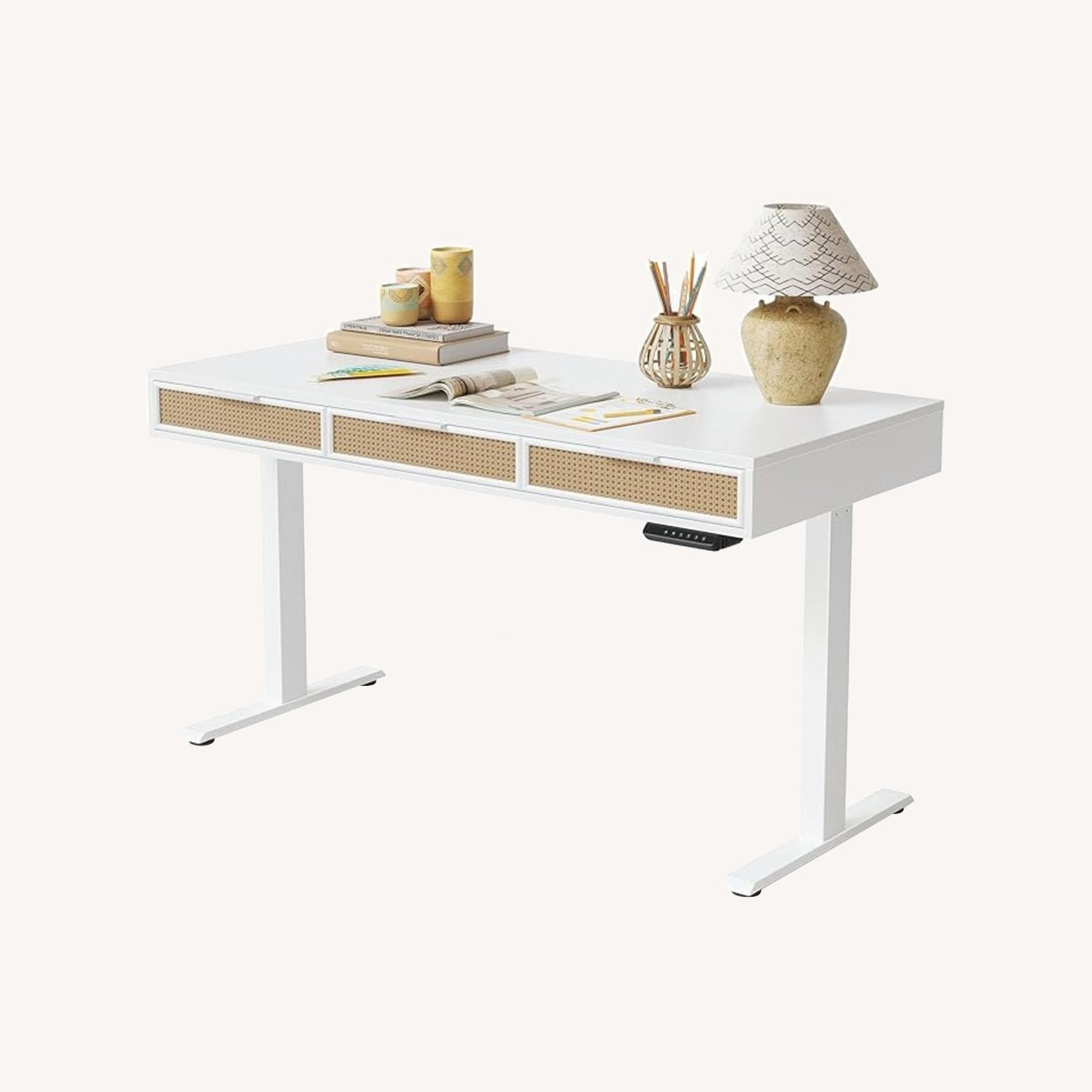 Seller's Notes:26"D x 55"W x 28.3"H (96 lbs) Height Adjustable Electric Standing Desk with 3 Rattan Drawers, Stand up Desk with Large Storage Space, White (monitors not included) Sold out online, paid $700 and paid for assembly but it’s too large for my space. Selling new barely used but assembled. About this desk: 3 Rattan Drawers: Fezibo standing desk feature a unique, practical design. Three boho style rattan drawers provide a larger storage space for your everyday items Whole-Piece Workspace: Spacious 55'' x 26'' whole-piece stand up desk top makes writing smooth and provides a wide space for working and writing. Easy Height Adjustment: The electric desk can be lifted from 28" to 47.6". And with 3 memory buttons, you can adjust to the best height with a simple press Solid Construction:The electric desk can hold up to 176 lbs while raising with lower noise(under 50 dB) due to sturdy industrial-grade steel frame and anti-collision features