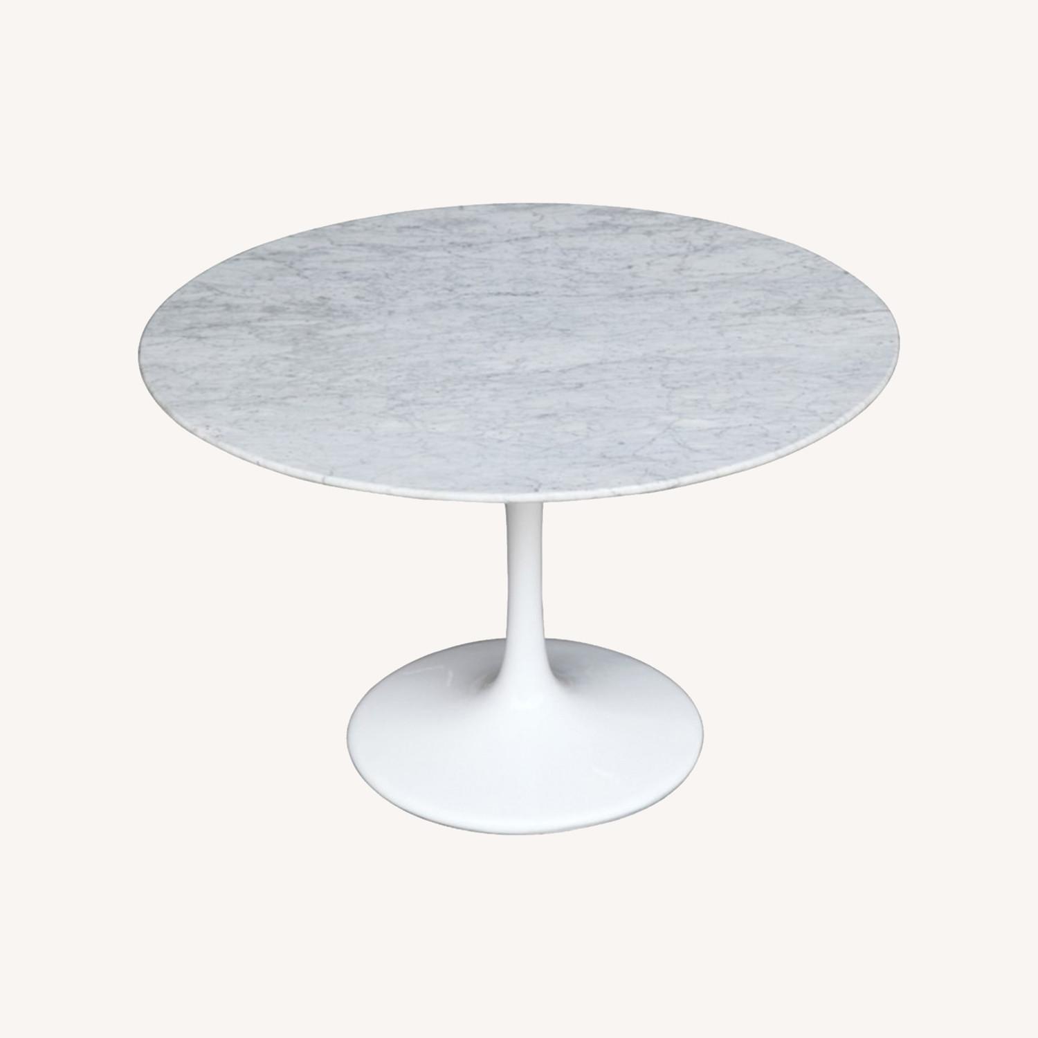 Seller's Notes:BRAND NEW! This table is white 39" diameter top. Sizes Available (Diameter): 32, 39, 48". COLORS AVAILABLE: BLACK, WHITE. This tulip style table has a Marble top, Its base is a heavy molded cast aluminum, while the shell is in reinforced molded fiberglass base. This item is a high quality reproduction of the original. Features Material: White Marble Top with White lacquered light gloss finish base Dimensions: 29.5"H x 39"W x 39"D (39" diameter top)