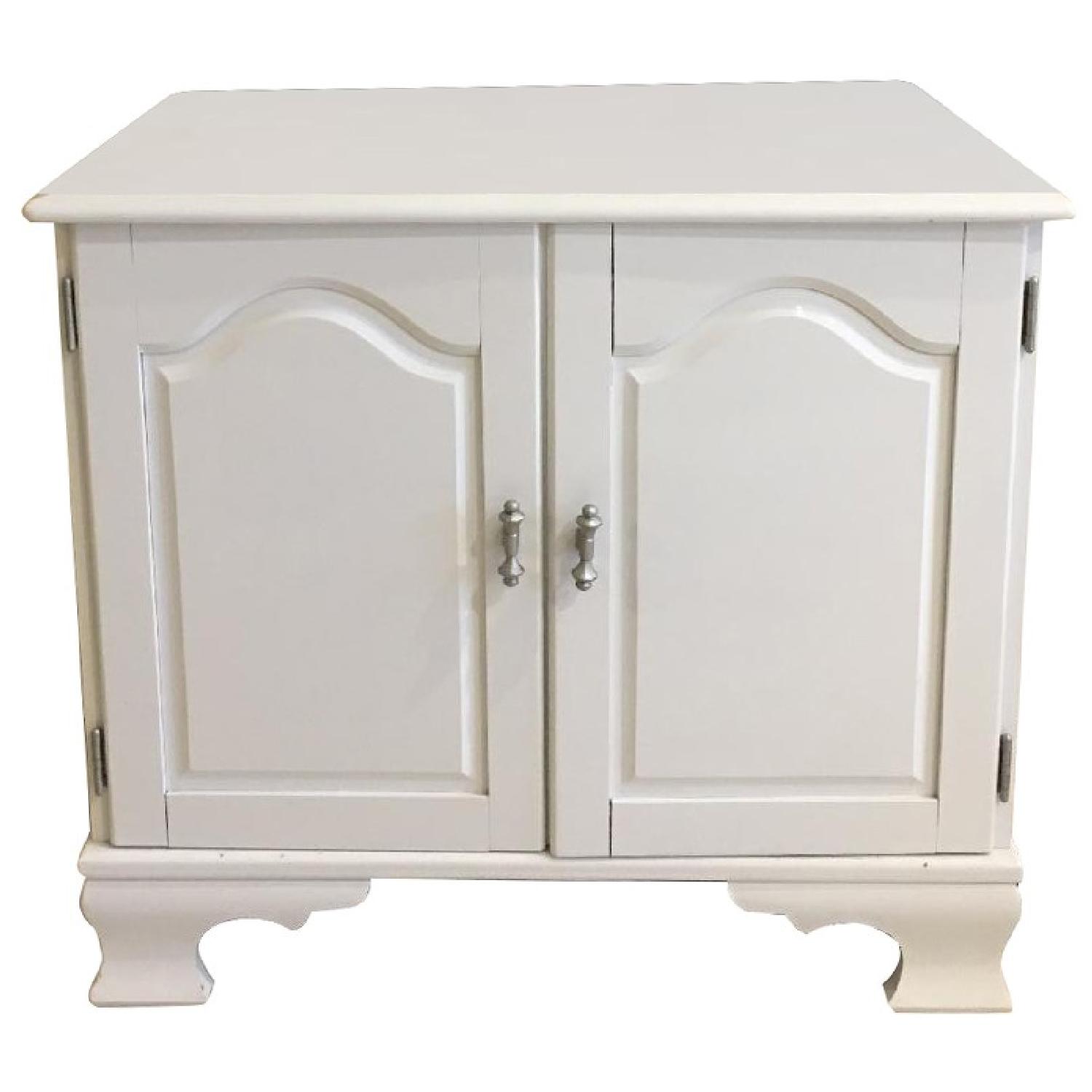 Seller's Notes:Great storage chest! I keep my HP Office Jet printer and office supplies in here. White wood with silver hardware. Has opening in the back for various cords.Trying to sell before I have to move at the end of the February!