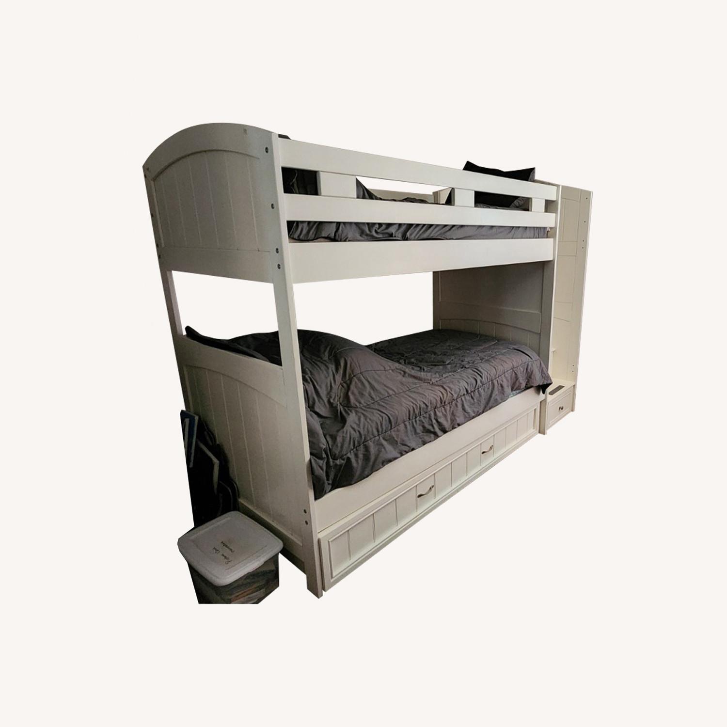 Seller's Notes:White Wooden twin size mattress Bunk Bed with plenty of storage areas. Large drawer under bottom bed for storage or another twin mattress for another sleeping area Each step on the secure stairway to upper bed is a pull out drawer for more storage. This bed was used for two years by my granddaughter and hasn't been used for years.