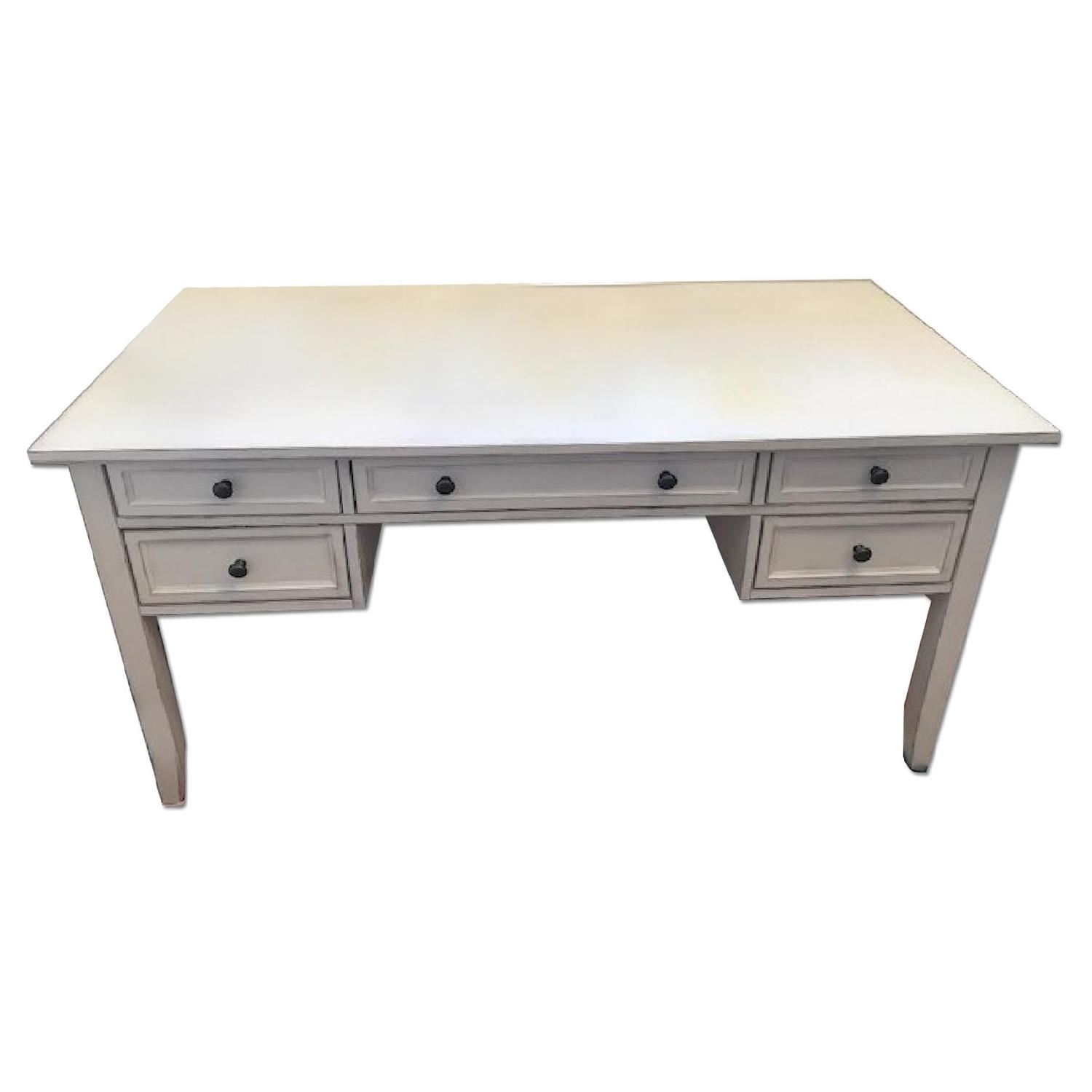Seller's Notes:I've had this desk for about 3 years and I love it, but it's a bit too big for our apartment so it's time for me to downgrade. The desk is still in great shape the only issue is a very light stain on the top surface (as pictured) and that the bottom left drawer sometimes sticks. It's a beautiful desk with 5 drawers that offer lots of storage space.