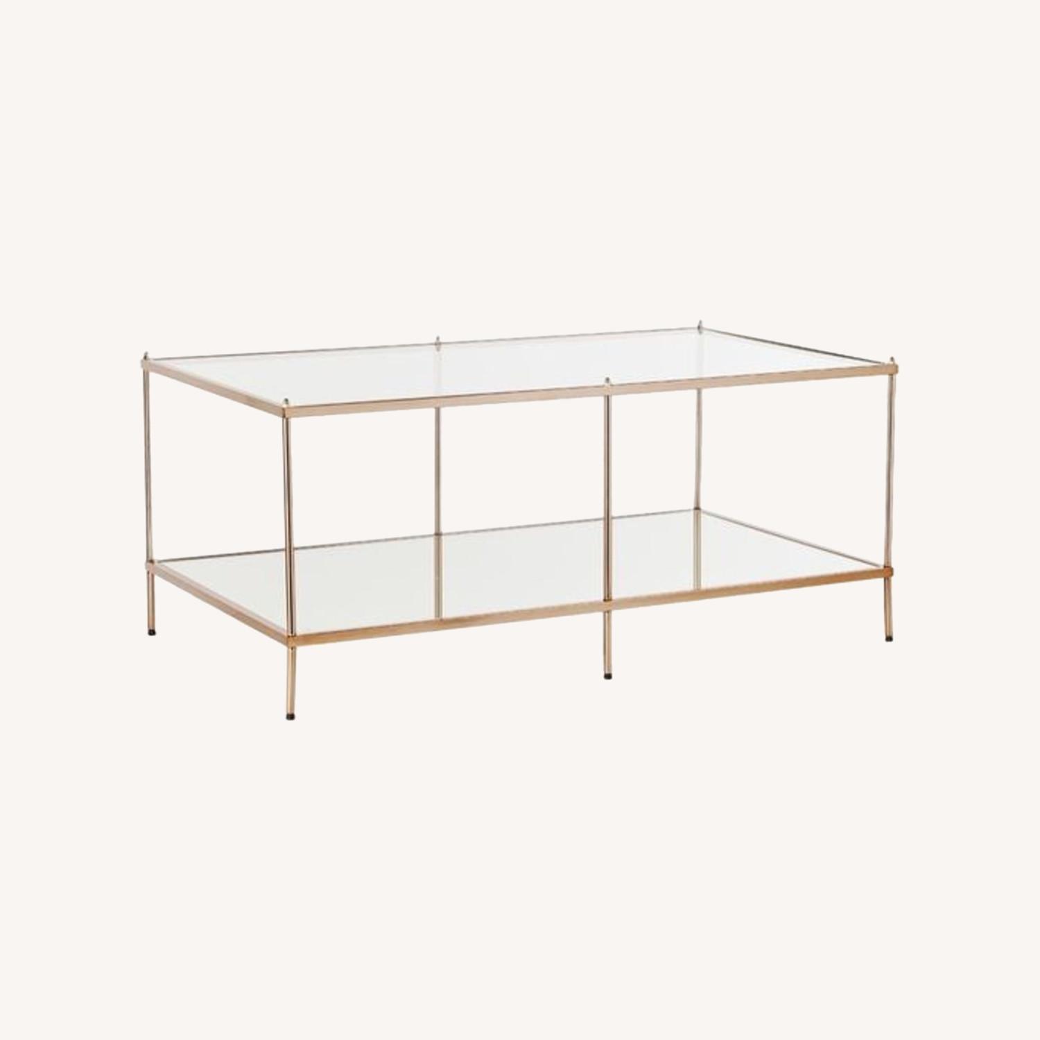 Seller's Notes:Willa Arlo Interiors Janelle coffee table with gold/ brass frame and glass table top and shelf.