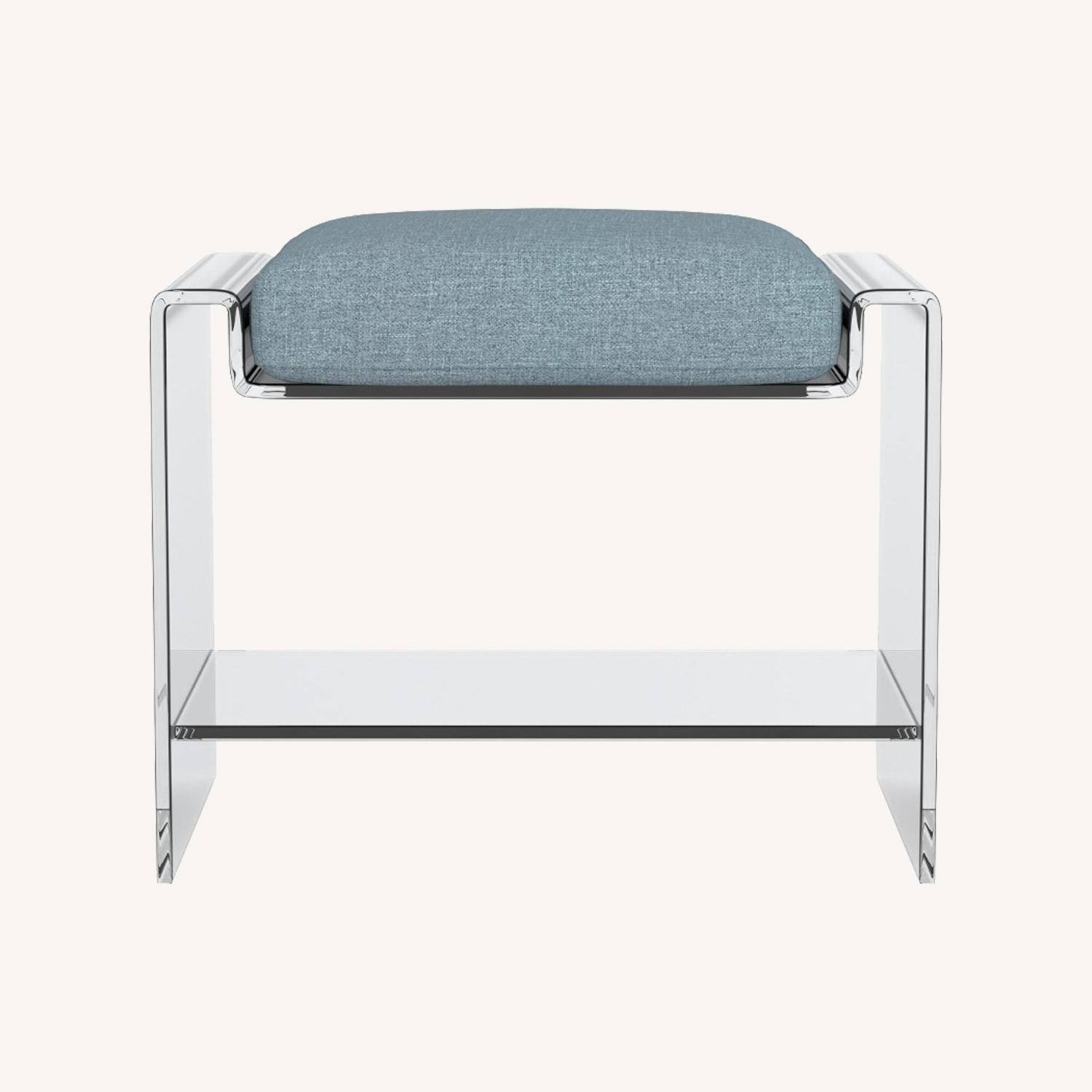 Seller's Notes:Blue, Performance Recycled Plush Weave Our versatile and chic Acrylic Stool is designed to sit in any space. The clear acrylic base is topped with a comfortable upholstered cushion. Place it near an entryway, at the foot of a bed or in any living space needing a fresh accent. Ideal in entryway, bedroom or living space. Upholstered cushion has resilient foam and fiber filling for plush, lasting comfort. Clear acrylic base creates floating effect. Sustainability GREENGUARD Gold Certified: This low-emitting product has been screened for over 10,000 chemicals and VOCs to contribute to cleaner indoor air and keep you and your family safer. By choosing our cotton products, you're supporting our investment in Better Cotton's mission. This product is sourced via mass balance and therefore may not contain Better Cotton. Learn more at bettercotton.org/massbalance. Available made to order in a range of our custom upholstery fabrics and leathers; to place a custom order, please call 888-922-4108 for assistance from one of our furniture specialists. 10–12 week in-home delivery with White Glove service.