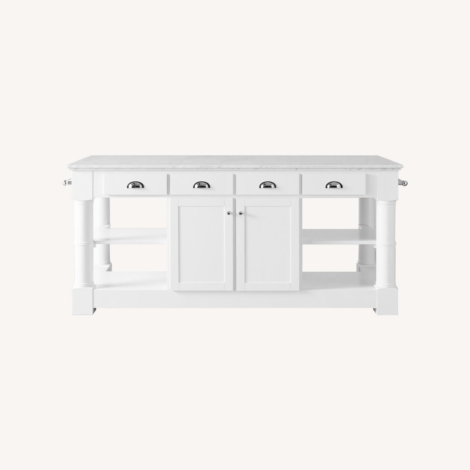 Seller's Notes:Exclusive to Williams Sonoma Home. Multifunctional island has comfortable seating space on one side and myriad storage options on the other. Straight-edge white Carrara marble top is richly veined with grey. Great for prep work and serving, the top offers the ideal surface for rolling out pastry dough. Four drawers provide ample space for cooks’ tools, flatware and other essentials. Four large open shelves offer plenty of room for storage and display. Two sturdy bars, one on each end, provide hanging space for kitchen towels. Variations in color and pattern are consistent with natural materials, making each piece unique. Collection also includes a single kitchen island. Quality & Craftsmanship Expertly handcrafted by skilled furniture makers. Legs, supports and frame are solid poplar. Levelers on legs provide stability on uneven surfaces. Drawers and doors are framed in solid alder with engineered wood panels alder veneer. Drawers have alder veneer and smooth solid-oak glides. Sturdy poplar plywood shelves. Finished in white paint with a lacquer finish. Hardware (drawer pulls, knobs and towel bars) has a Polished Nickel finish. In-home delivery with White Glove service.