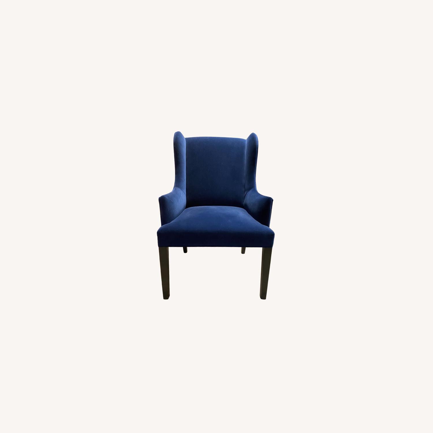 Seller's Notes:Beautiful blue velvet Williams Sonoma armchairs. Incredibly comfortable. We used as head chairs for a dining room table - it’s a great accent to more neutral colors. Can also be used in a living room or as an office chai. This listing is for both chairs as a set. We have TWO chairs and are happy to sell as a set. Sloped arms and a crowned seat cushion soften Belvedere's clean-lined look. The versatile design pairs readily with any style of dining table, while the generous padding makes it an exceptionally comfortable seat for the living room or bedroom as well. In near perfect condition.