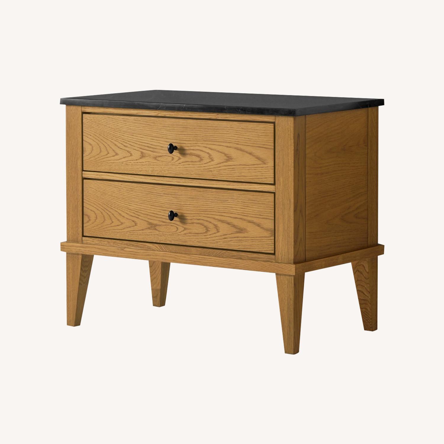 Seller's Notes:Designed by our team at our Williams Sonoma Home studio in San Francisco. Topped with smoothly honed and polished premium marble. Solid oak base has a natural hand finish. Two soft-close drawers with Bronze-finish pulls offer ample storage. Natural variations in the color and pattern of the wood and stone make each piece unique. Quality & Craftsmanship Handcrafted by skilled artisans. Topped with premium solid marble that is expertly honed and polished. Built of kiln-dried solid American white oak. Reinforced with double dowels and corner braces for enduring strength. Hand finished in a multistep process and protected with oil-based matte lacquer. Drawers are crafted with English-dovetail joinery and set on soft-close glides. Zinc alloy drawer pulls have Bronze finish. Adjustable levelers keep nightstand balanced on uneven surfaces and protect flooring. Contract grade. In-home delivery with White Glove service.