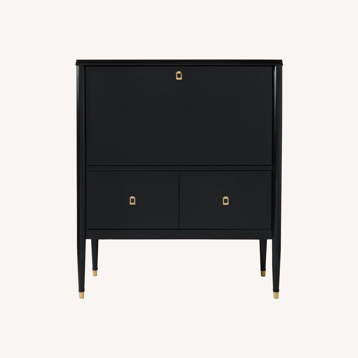 Seller's Notes:Stunning wood cabinet/desk with hinged front (pull down) that serves as desk. It opens to reveal two cubbies on each side, two drawers and shelved center compartment with wire management and space for 22" monitor.