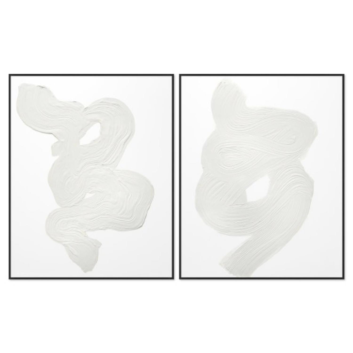Seller's Notes:This listing is for a BRAND NEW set of 2 Williams Sonoma “Neutral Swirl” Wall Art. I just purchased less than a month ago directly from vendor. The prints have only been taken out of the box to take a few pictures, and since have been in storage unit. The blue wrap you see in pictures is just protective wrap. Website description: A refreshing white-on-white palette gives these gestural works their modern style. Lushly textured like the original piece that inspired them, each hand-painted reproduction brings movement and interest to the home. Part of the Thom Filicia Home Collection, they embody the designer’s timeless style. Hand-painted reproduction of an original, one-of-a-kind oil painting. Paint on gallery-wrapped raw canvas. Solid wood floating frame has a matte black finish. Ready to hang with D-rings on the back. Overall: 41"W x 51"H; 2.25"D. Image only: 40"W x 50"H. 29 lb. Art: Made in USA. Frame: Made in Brazil.