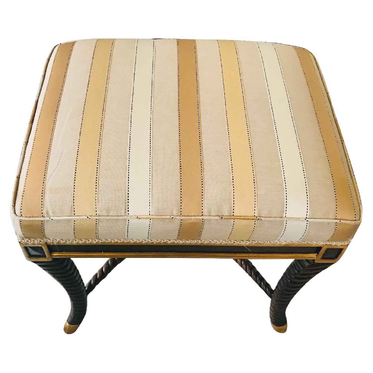 Seller's Notes:Hand carved English Regency style Ram's Foot bench and boxed seat. It is a beechwood base with ebony finished rope twist legs and gilt deer hoof feet. Each has a gold leaf trim and custom fabric by William Switzer.