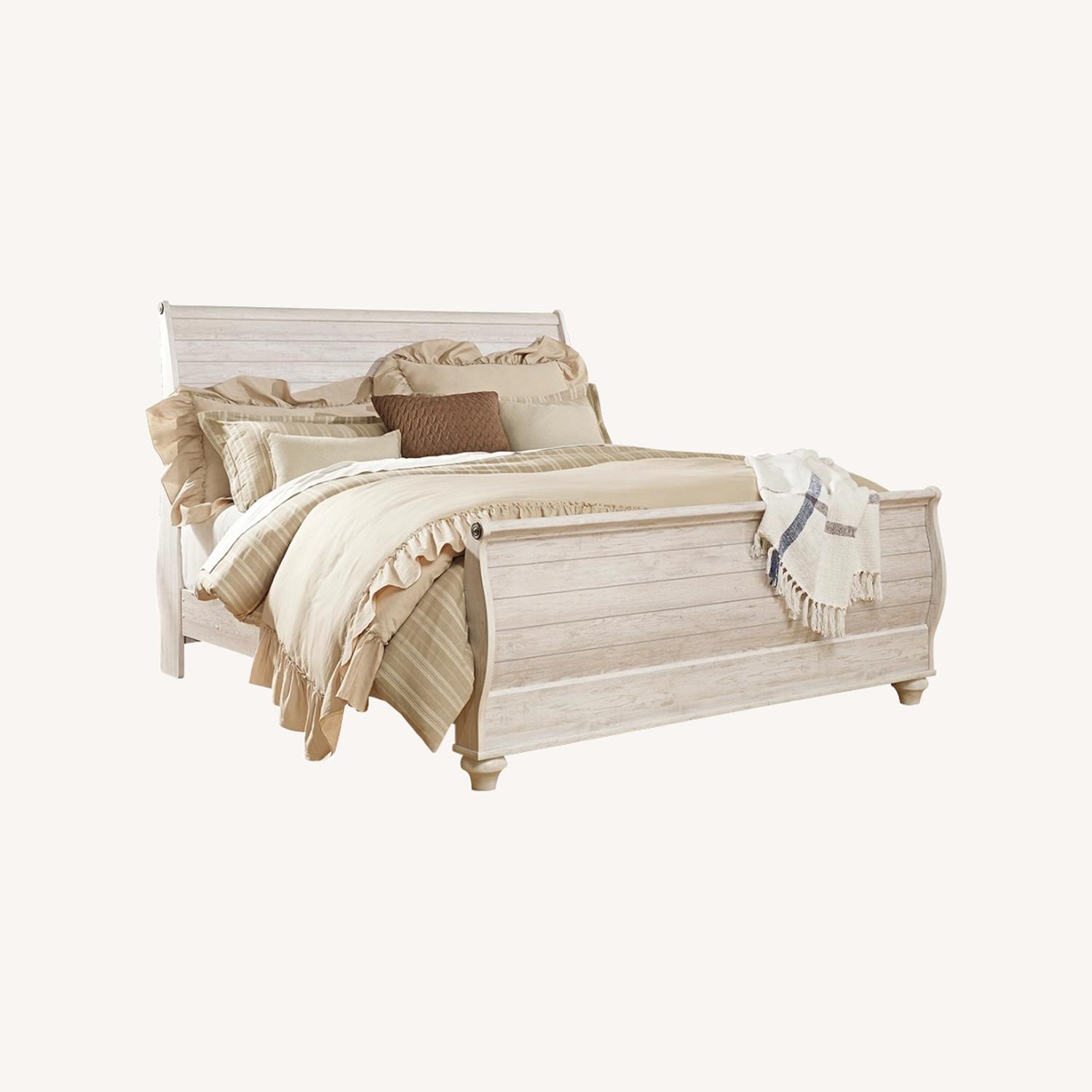 Seller's Notes:The ultimate look for a beach cottage or shabby chic inspired retreat, the Willowton king sleigh bed carries you away to a dreamy time and place. Its driftwoody whitewash finish is wonderfully easy on the eyes. Faux plank detailing incorporates a classically rustic touch that's so homey and comforting. Mattress and foundation/box spring sold separately.