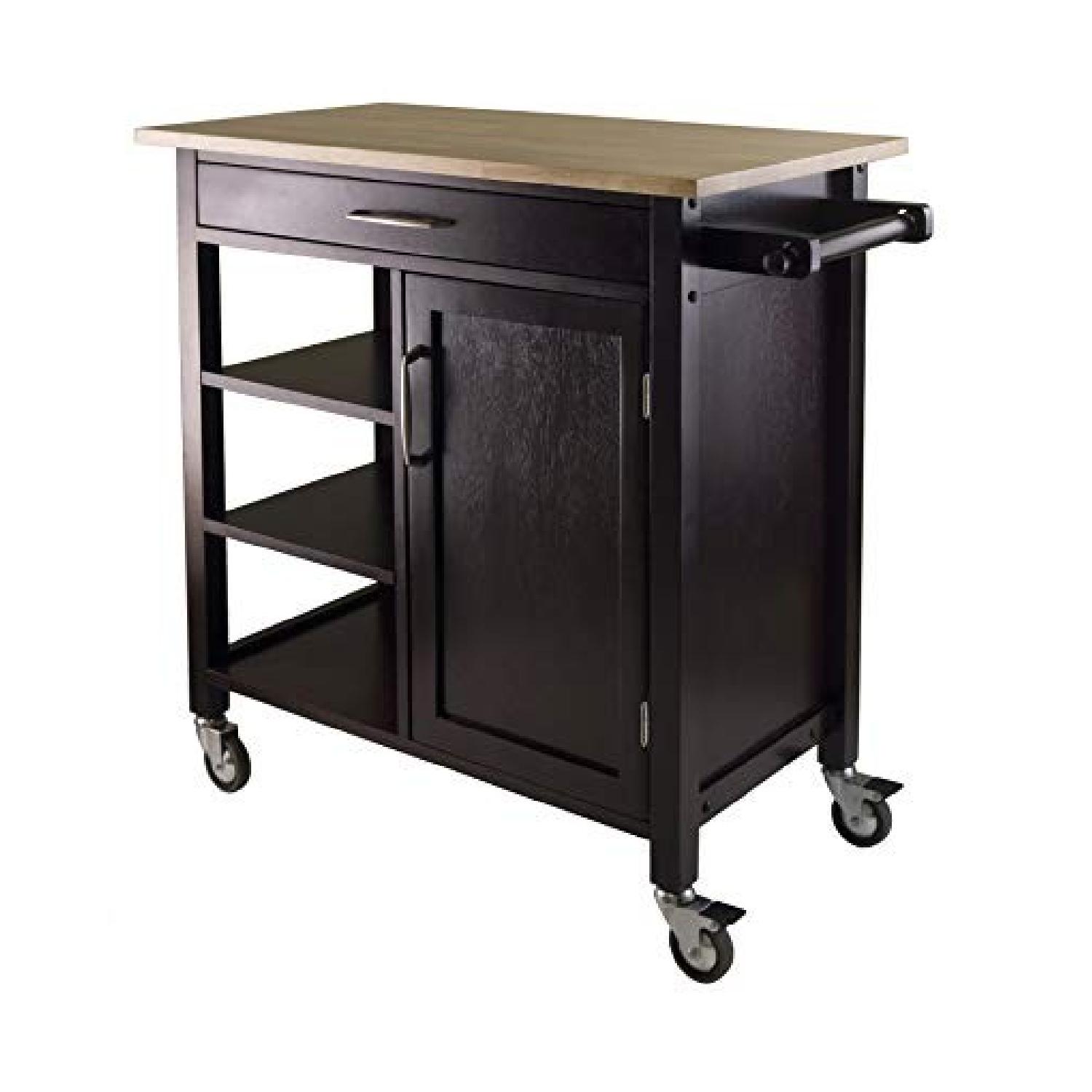 Seller's Notes:Comes Assembled Mali two-tone kitchen cart features natural wood top with dimesion 33-inch w by 18.5-inch d and espresso body with one large drawer, 3 shelves and cabinet with one removable shelf. Drawer inside dimesion is 24.80-inch w by 13.31-inch d by 2-inch h. 3-open shelf sizes 12.83-inch w by 15-3/4-inch d. Cabinet opening 13.39-inch w by 14.72-inch d by 22.44-inch h, door opening 13.22-inch w. Shelf inside cabinet is removable and fixed one position. Made of combination of solid and composite wood in natural and espresso finish. Expand your kitchen storage possibilities with Mali Kitchen cart with two-tone. This multi function cart and plenty of storage fits beautifully in any space. Cart features natural wood top, a drawer, 3 shelves plus a cabinet with one shelf.
