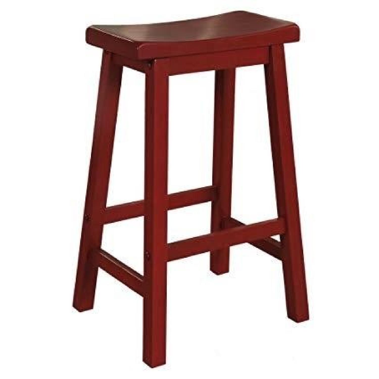 Seller's Notes:Crimson red bar stools that we have been using in our kitchen. Most of the wear and tear is near the bottom. Either on the bottom of the legs, or the horizontal bar where people rest their legs. For the most part you can’t see the scratches. The red is a deep crimson and you can see the natural detail of the wood which is really beautiful.