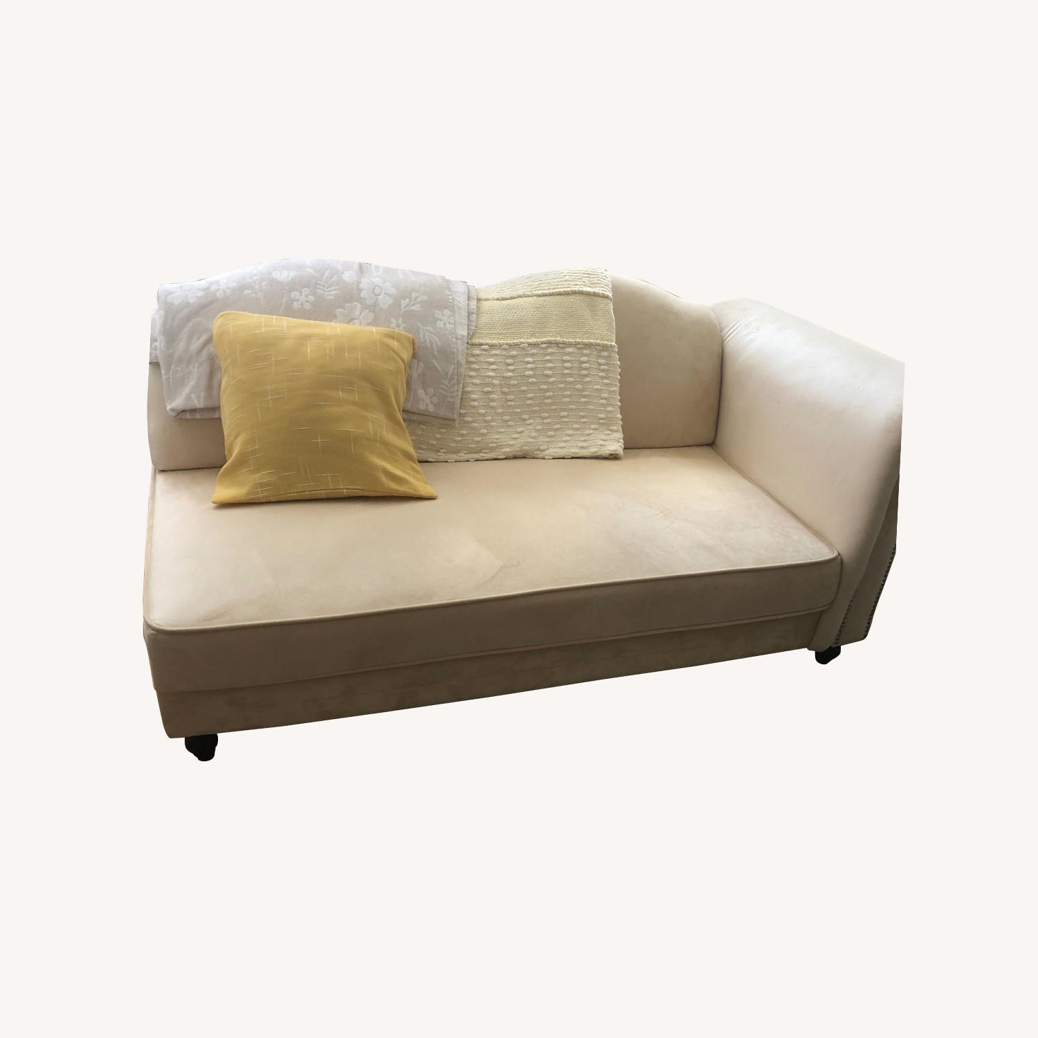 Seller's Notes:This a beige colored chaise sofa, dimensions is 59in x 30in, it is perfect for small spaces and dorms. It includes (4) small pillows that are beige colored