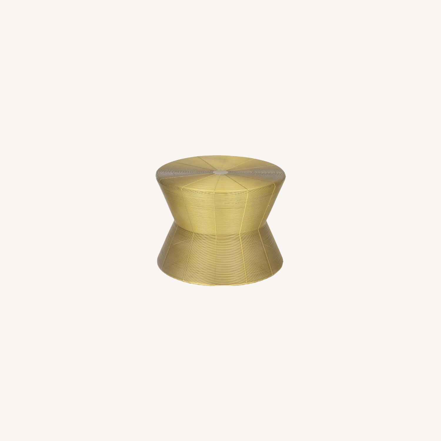 Seller's Notes:Solid and golden, the transitional Reginald wire golden side table is a sculptural accent in the living room or family room. A perfect combination of form and function, the light and airy piece is crafted of iron in a golden epoxy finish. This coffee table is sure to be a conversation piece.