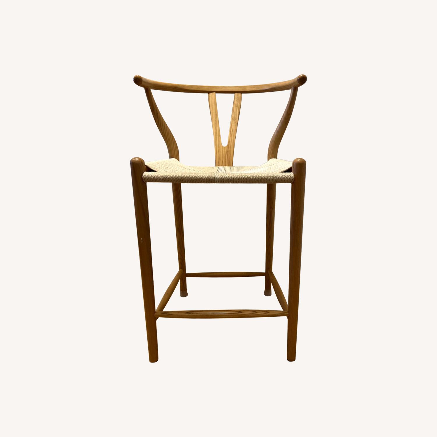 Seller's Notes:Wishbone counter stools with woven seat. The seats have a bit of staining that can be cleaned and the wood has a few dents here and there. The seats are in perfect condition otherwise. The seat height is 26"h and seat back is 36"h.