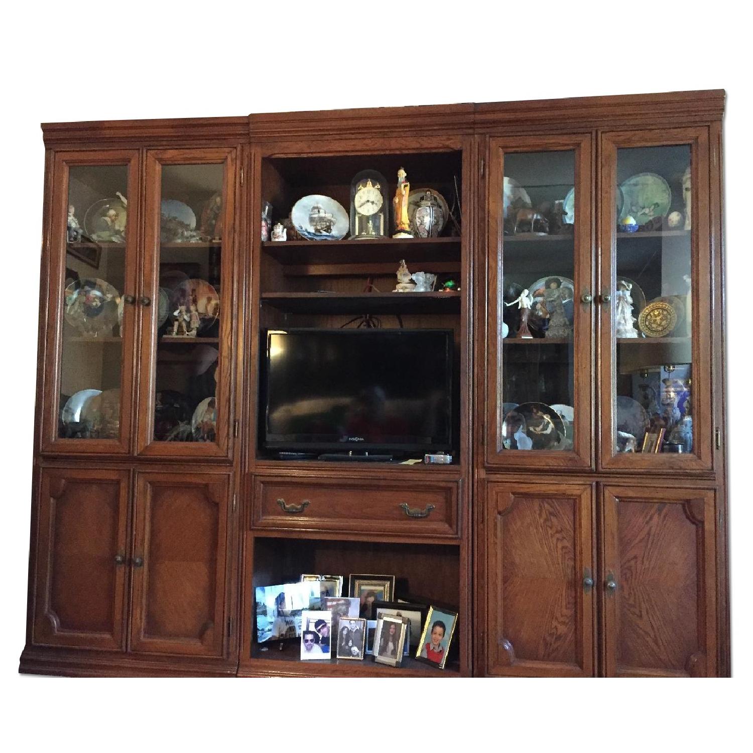 Seller's Notes:Wall unit. 3 pieces. It has two side matching bookshelves and a center piece that can house a TV (30" wide). Each bookshelf has 2 adjustable shelves, and a cabinet that has two shelves for hidden storage. It is in fantastic shape and the three pieces can be used together (as displayed) or separated. Dimensions are as follows-- Each side unit is 78" high x 31.5" wide x 22" deep. The center unit 33.5" wide x 22" deep.