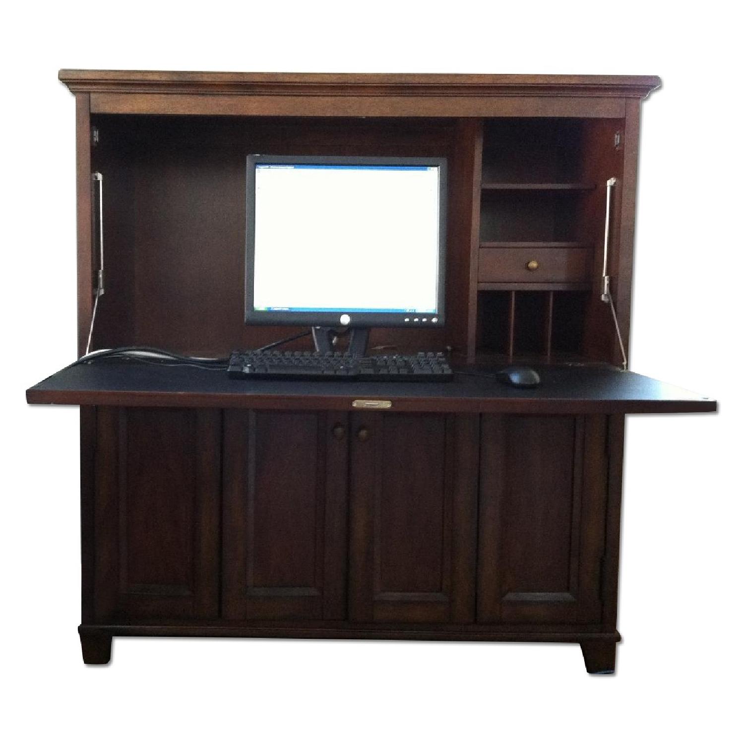 Seller's Notes:Beautiful Wood Desk with Hutch. Excellent Condition. Lower section is for file storage. Upper section can be opened up as desk or closed when not in use.