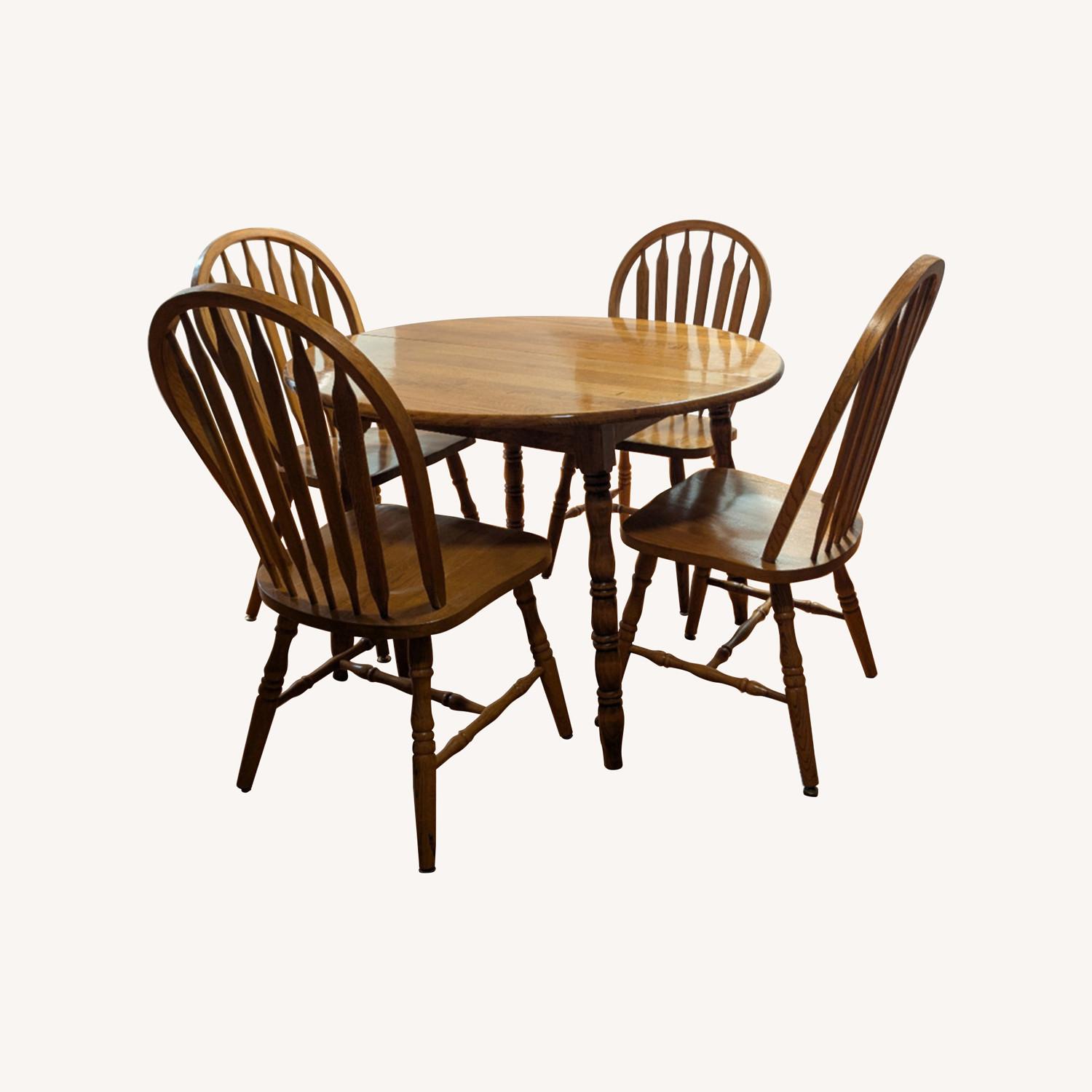 Seller's Notes:Solid wood expandable dining table with four solid wood chairs. The table includes one leaf. With the leaf the table top measures 53" by 42". Without the leaf the table has a 42" diameter.