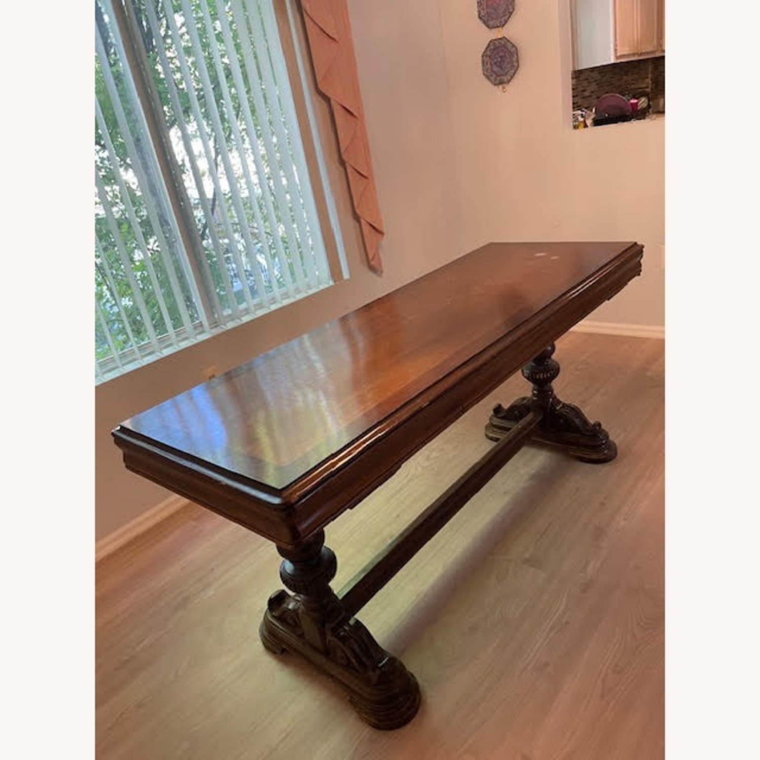 Seller's Notes:This dark wood Dining Room/Library table was owned by my Great Grandparents in Brooklyn, NY and is at least 100 years old. It has beautiful carved legs. I listed the depth as 25", but it also opens up on both sides, adding about 4" on each side, for a total depth of around 33". There are 3 white discoloration marks on the table top (you can see them in the photo). There are also some scratches here and there. On one the short sides (close to where the white discoloration marks are. depth side) the wood is a bit loose and needs to be attached better to the rest of the table. Table is slightly wobbly but in decent condition.