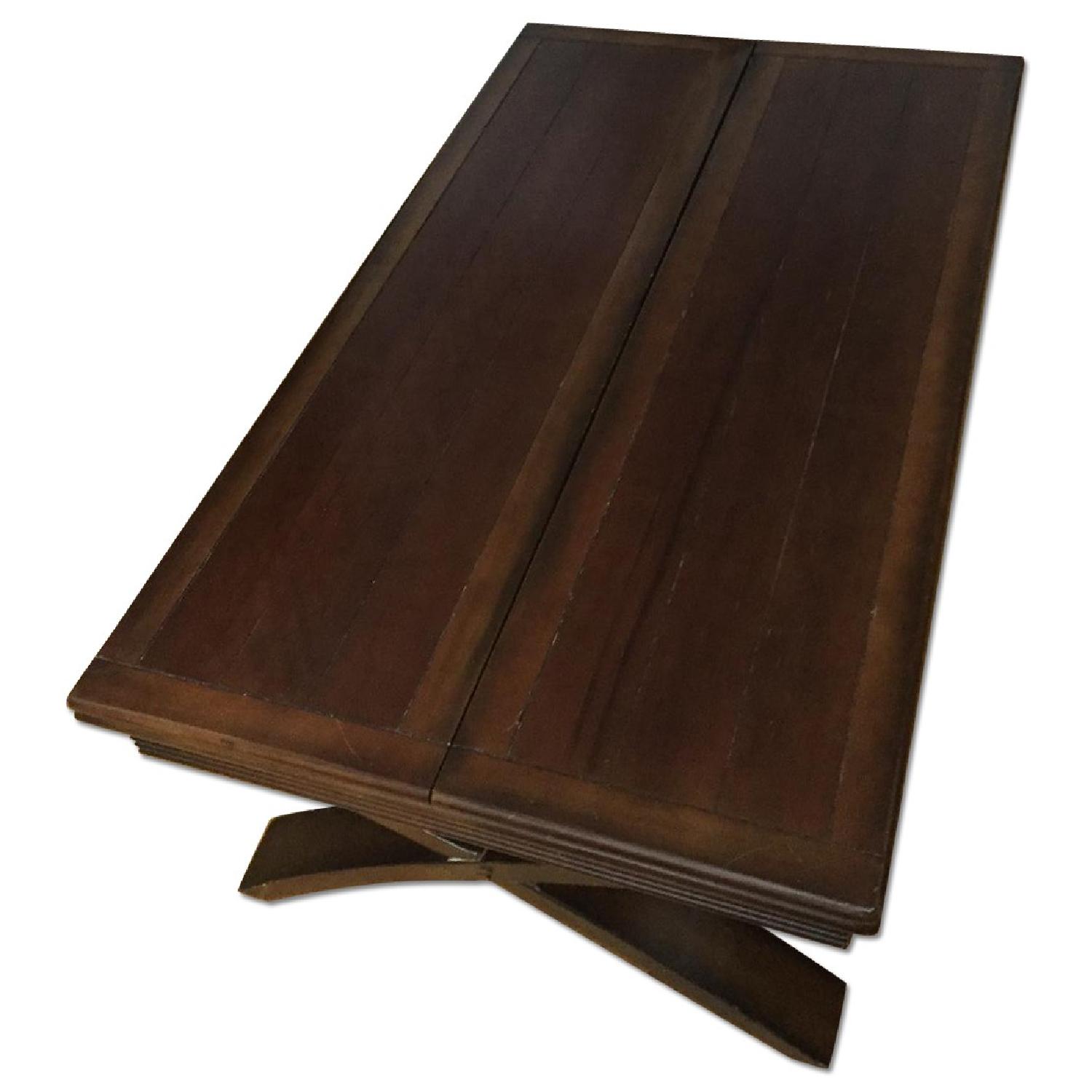 Seller's Notes:Table expands to 60 inches deep from the closed 30 inches, at a height of 17 inches. Table is being sold because I bought a new table from a friend to maximize space in my new apartment and do not have the room for two tables, but this table is still in very good condition for the time that I have owned it. Has one small stain on the top of the table, when not expanded, which is about 3 inches long.