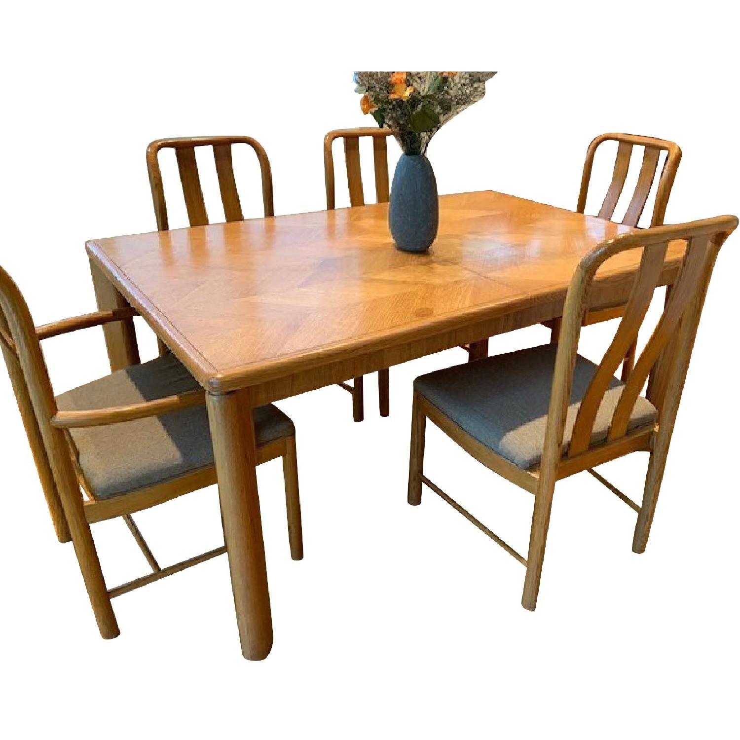 Seller's Notes:Newly Refinished Wood Kitchen Dining Set. Table is 40x62 with 2-20" inserts Set includes 5 chairs with light gray upholstery We're moving and unfortunately can't take it with us!