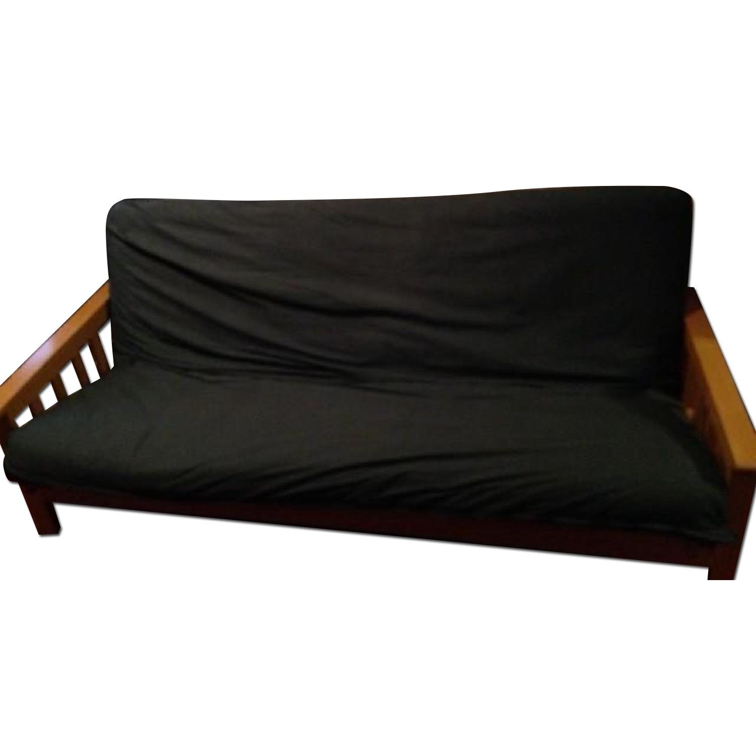 Seller's Notes:This is a fold-out wood-frame futon couch/bed. It has a solid wood, varnished, oak-toned slatted back and armrests in a kind of Mission style. The frame is in excellent mechanical condition. It shows some slight wear and scratches from normal use but looks very good overall. The futon is clean and in good condition; it has always been kept in a cover, and has always been in a non-smoking, non-pets apartment. There is one small stain about 3" wide on the edge of the futon where something soaked into it; it is invisible under the cover. The cover is dark green cotton (sort of a British Racing Green), and in good condition. There is also a grey slipcover that goes over the whole thing to make it look more like a regular couch. Both covers have just been laundered.
