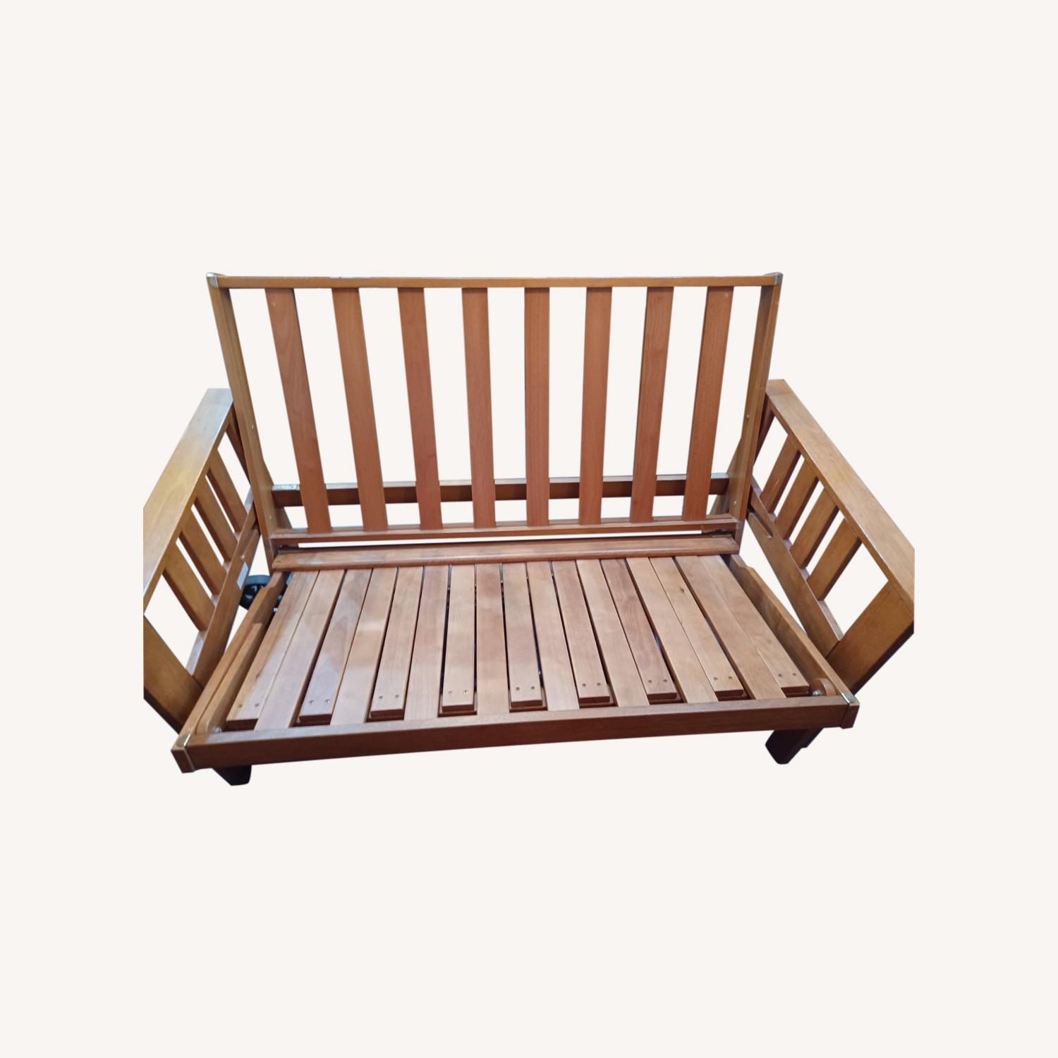 Seller's Notes:Wood frame futon. Transforms flat to accommodate sleeping. The frame is sturdy.