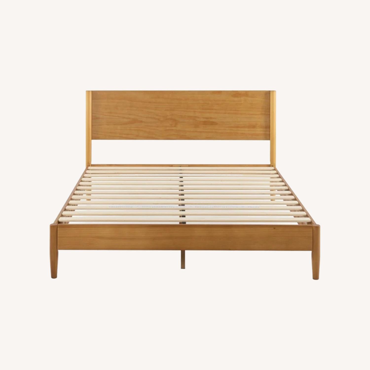Give your bedroom a mid-century modern makeover with this bed frame that stunningly combines classic elegance and contemporary minimalism. Its rounded legs and a warm, wood-toned finish make a statement, while its low profile accentuates its subtle style. The sturdy headboard offers solid support, and the solid wood frame provides a stable foundation for your mattress without the need for a box spring. Closely spaced wooden slats ensure long-lasting support and breathability, helping extend the life of your mattress. Thoughtfully packed with all the tools, parts, and step-by-step instructions, it ships in one box for easy assembly.
