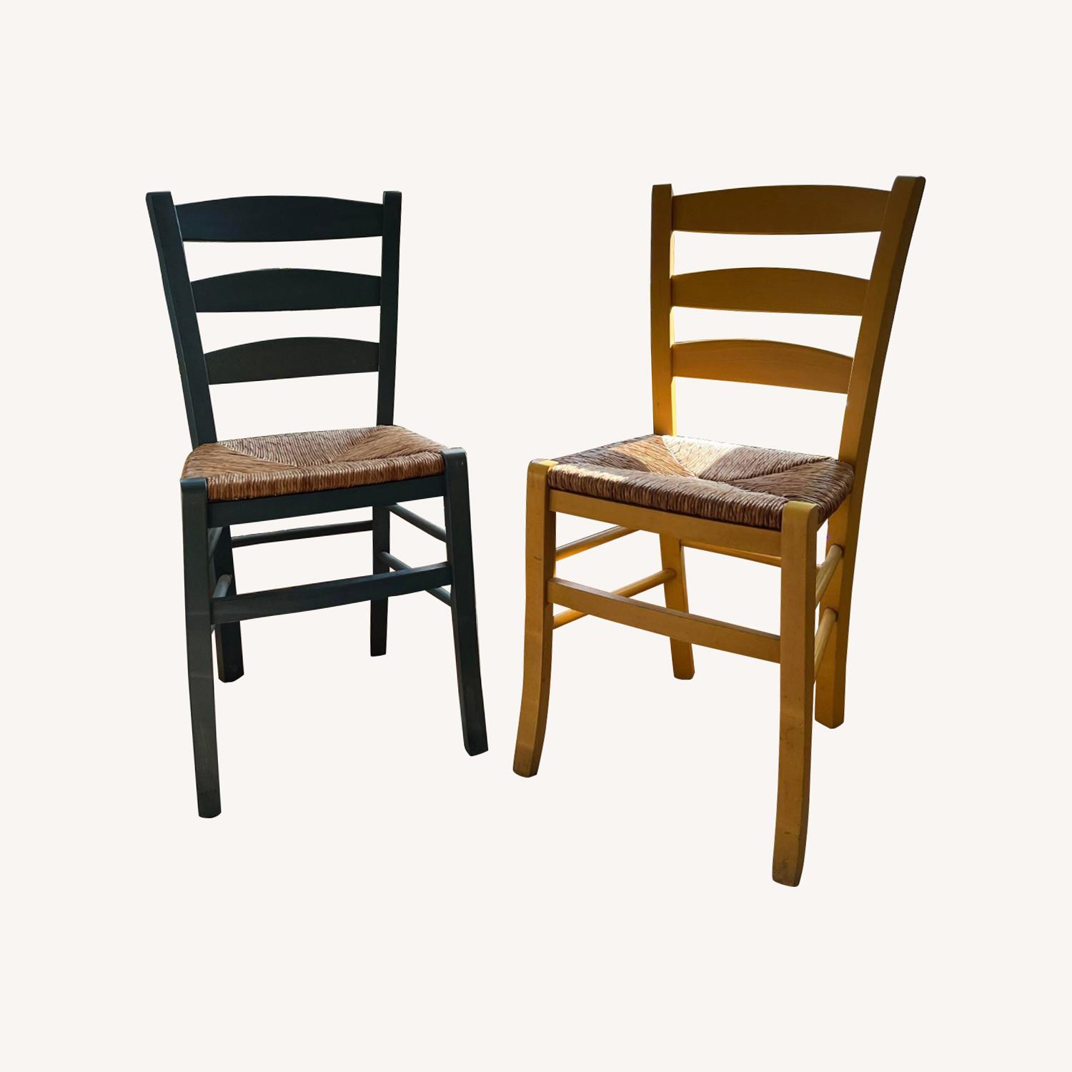 Seller's Notes:A set of wooden dining chairs with rattan seats. Surprisingly comfy and sturdy, they're cute as dining chairs, plant stands, or extra seats to have around for a garden.