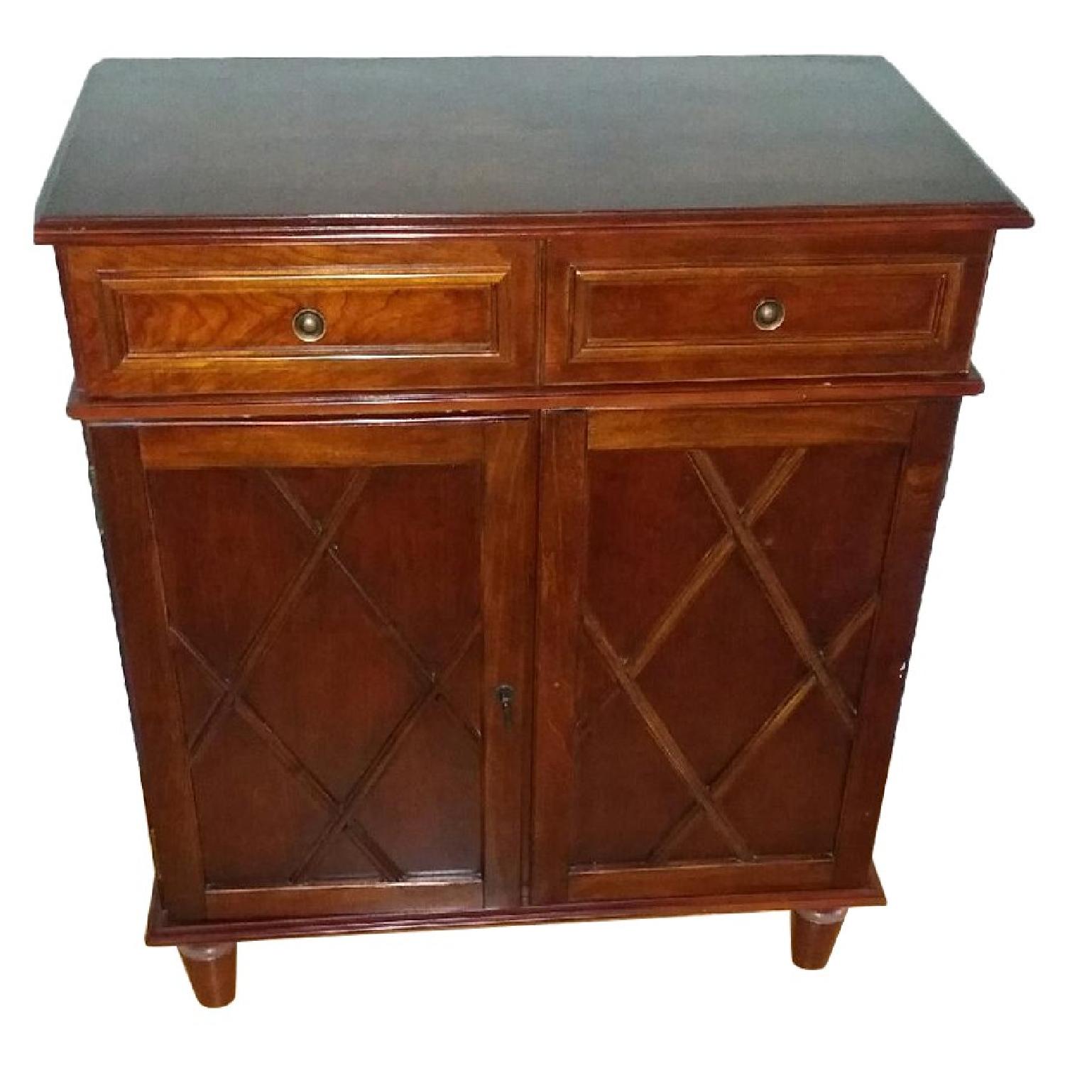 Seller's Notes:Great small cabinet, perfect for entry hall, living room or bedroom. Mahogany color, with simple diamond shaped wood trim. Missing one door pull. One moveable shelf inside.